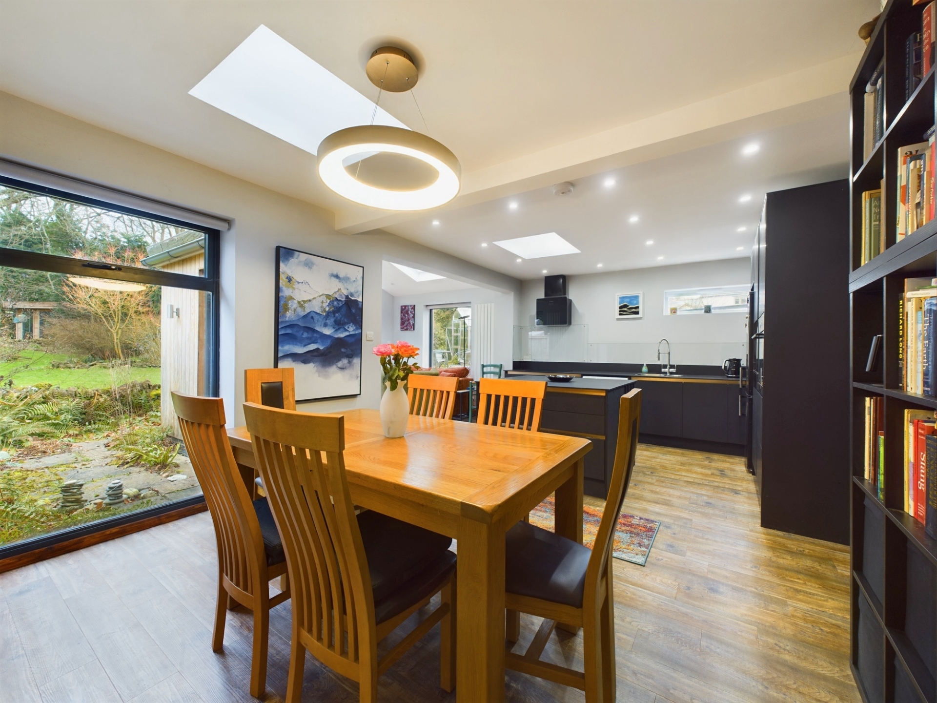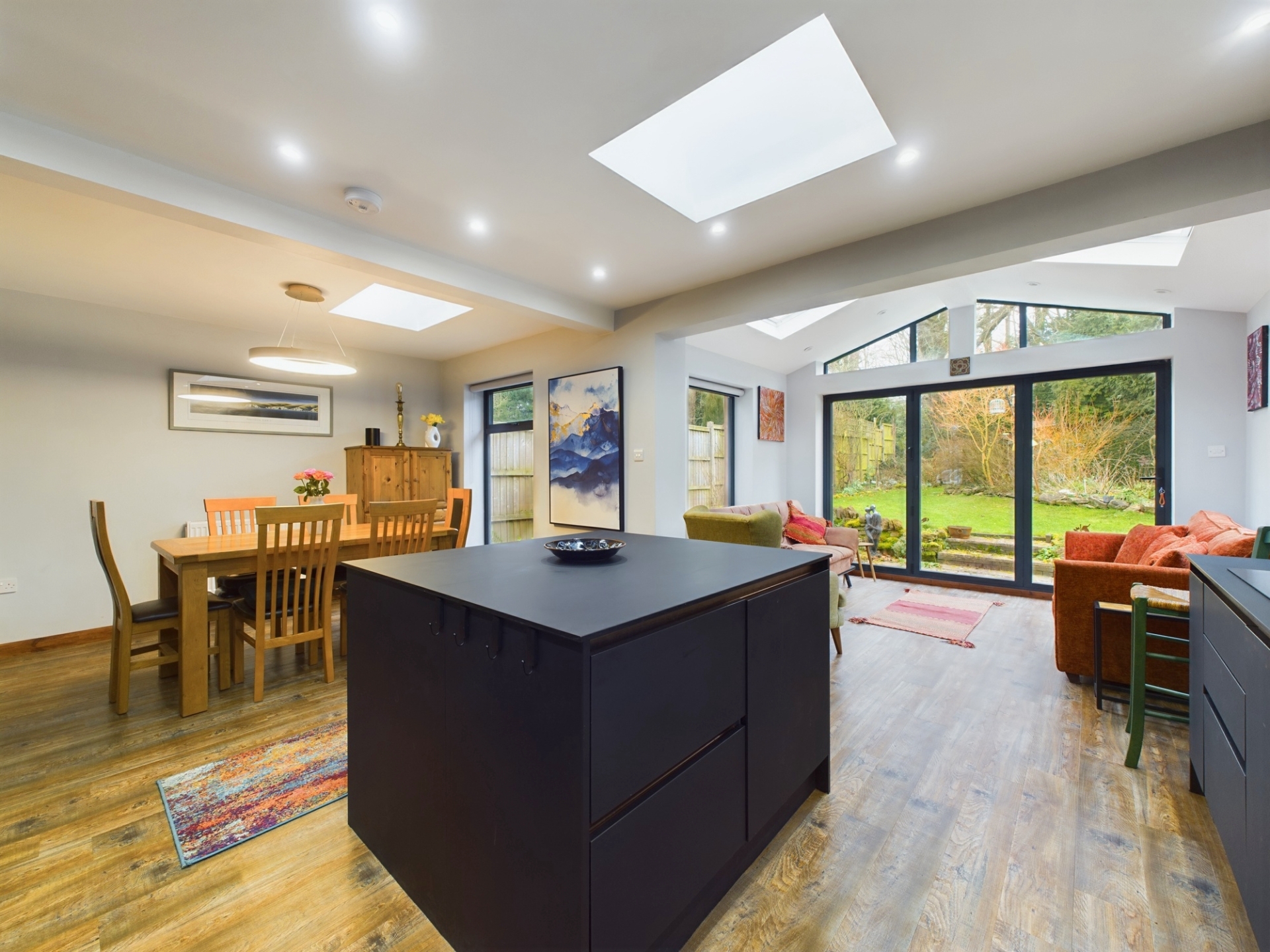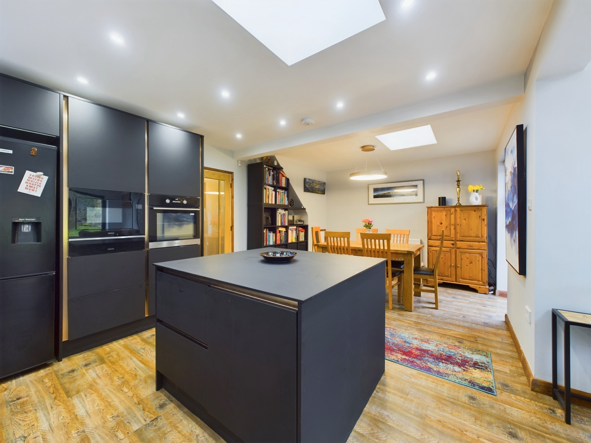 uPVC double glazed windows to side profiles and bi-fold doors to rear elevation. uPVC double glazed window to side elevation. Four Velux windows. Two wall mounted decorative radiators & double radiator. A range of wall and base units with Solid FENIX work surfaces. Integrated oven and microwave. Space for white goods. Stainless steel sink with stainless steel mixer tap. Splash back panels to splash areas. Ceramic hob, extractor fan and central island unit. ,