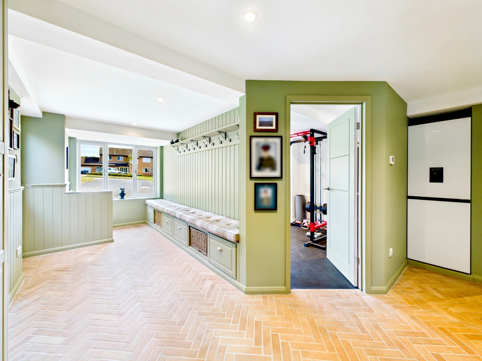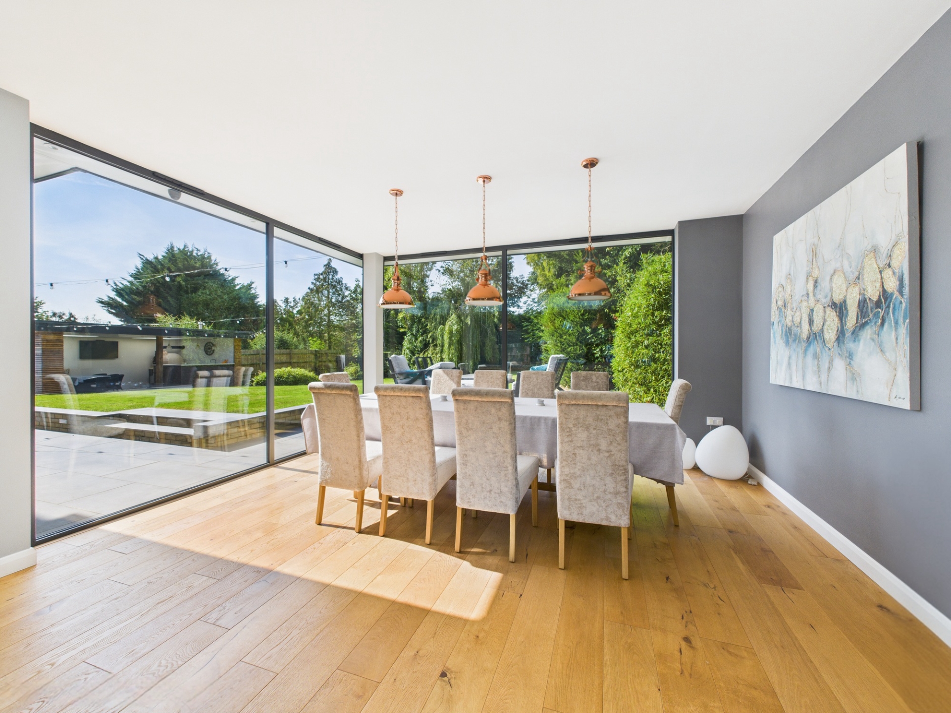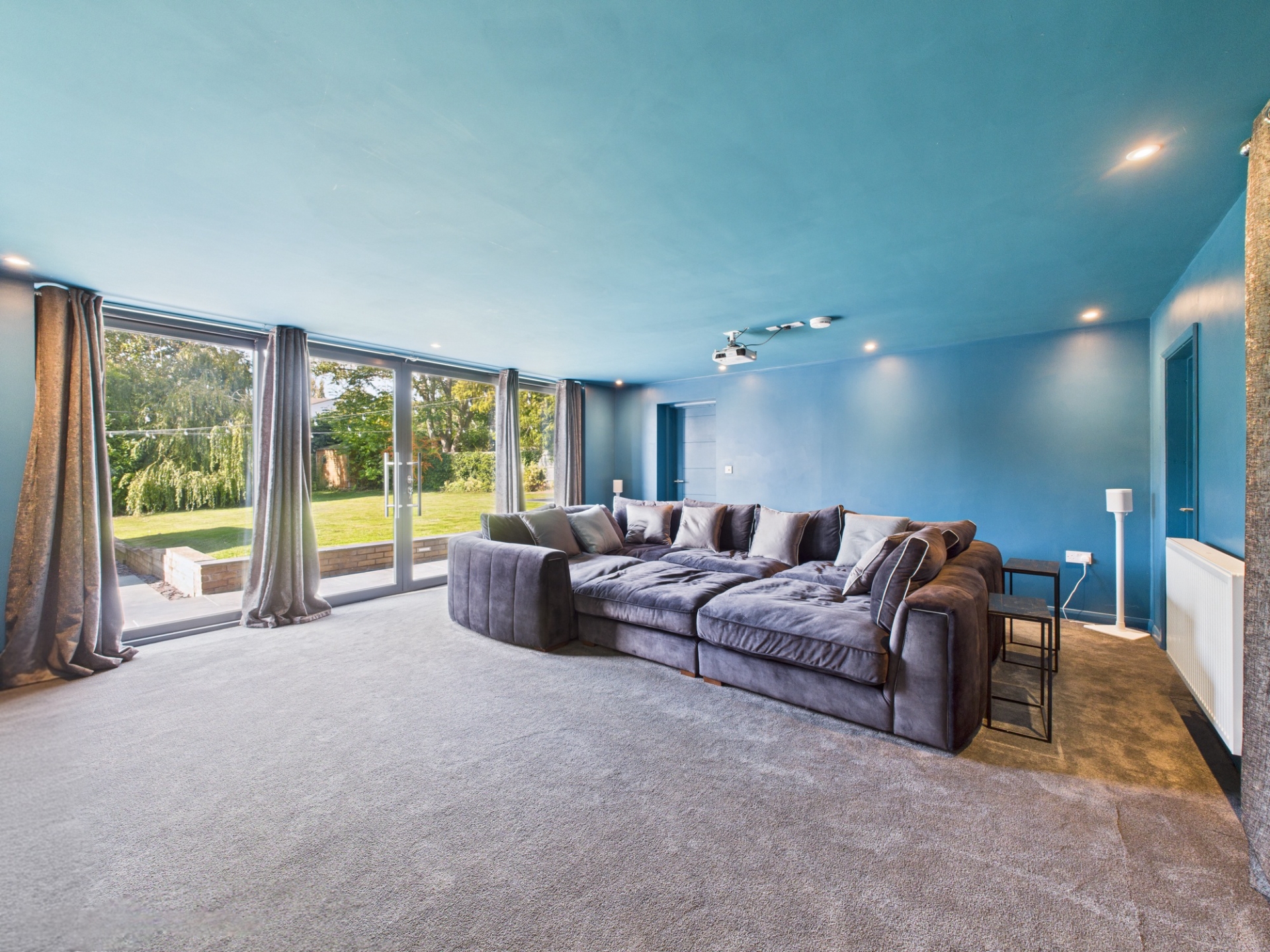 Off the kitchen is a newly fitted utility room and an exceptional boot room, complete with a dog shower and terracotta herringbone tiled flooring. From here, you also have access to the home gym. On the opposite side of the kitchen/family room is the enticing cinema room. Behind tall blackout curtains are more floor-to-ceiling windows and sliding doors, mirroring the kitchen and enhancing this space’s versatility.