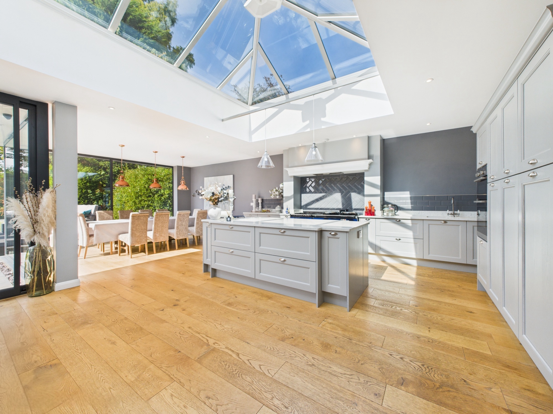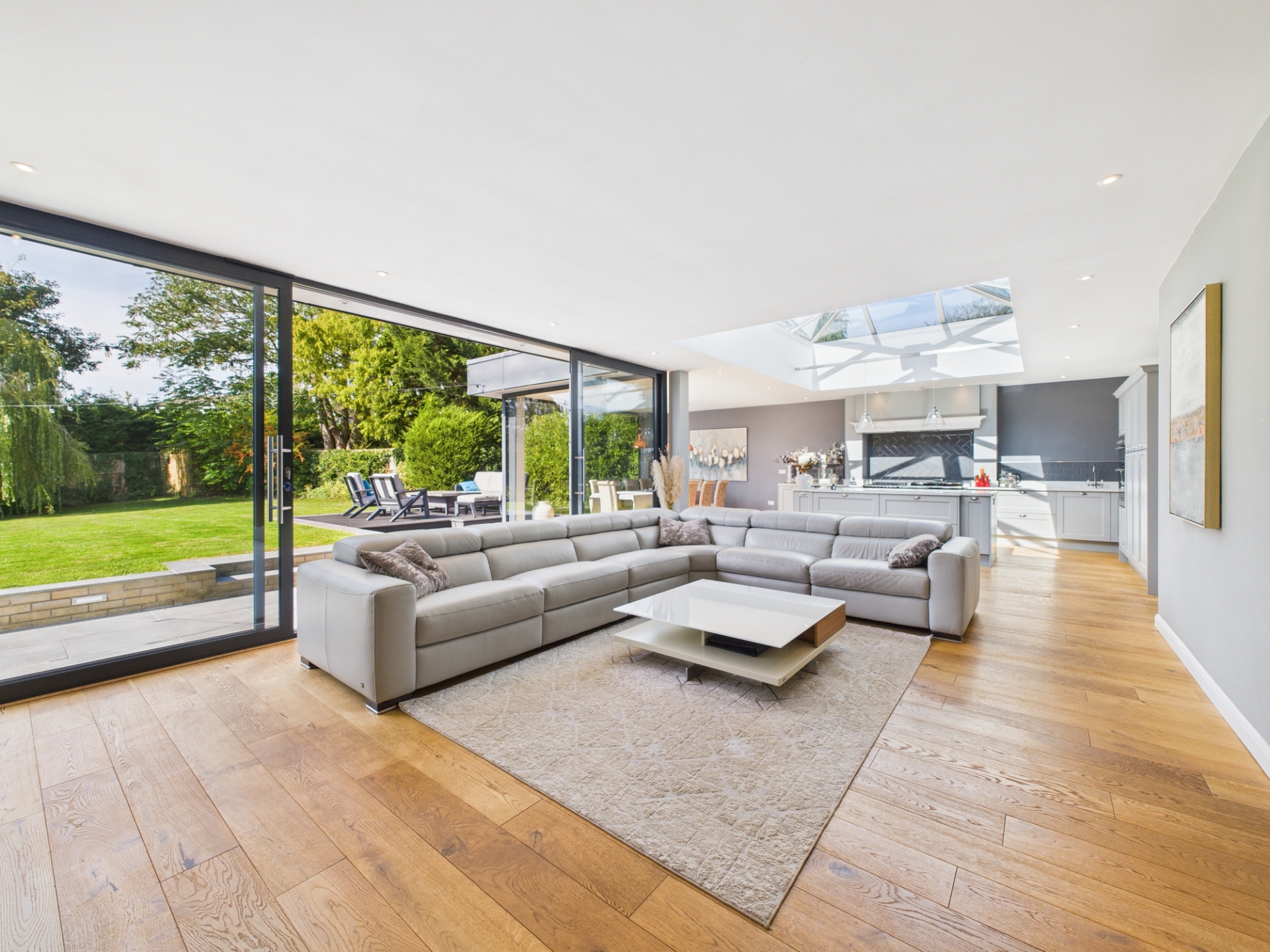 This stunning open plan space measures an impressive 28’9” x 36’11” and comfortably accommodates a family area with fireplace, dining area, and a high specification kitchen. The kitchen is fitted with quartz worktops, a central island, and large dual fuel AGA. The room is bathed in natural light thanks to a sky lantern and floor to ceiling windows and sliding doors overlooking the garden.