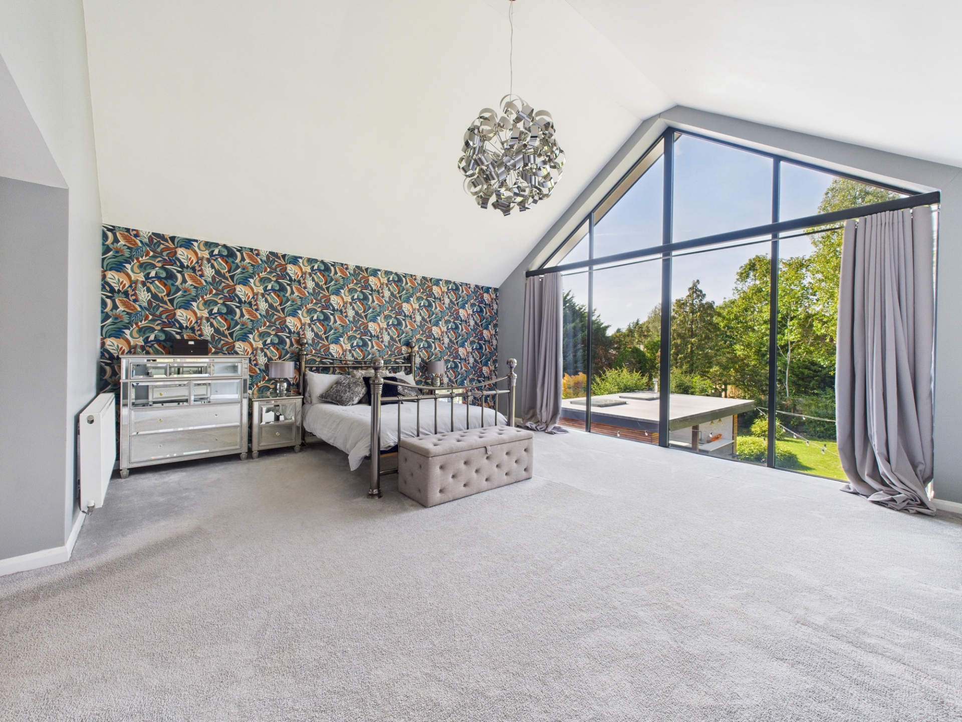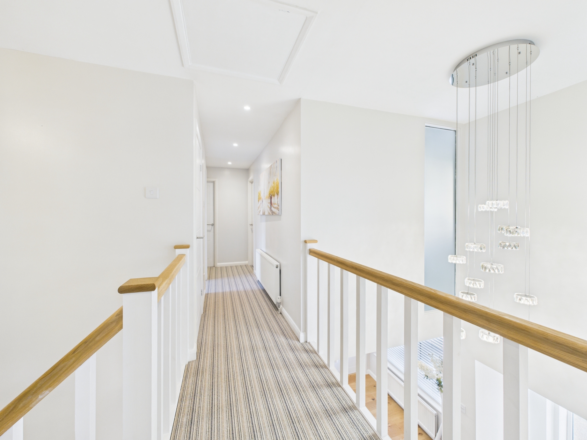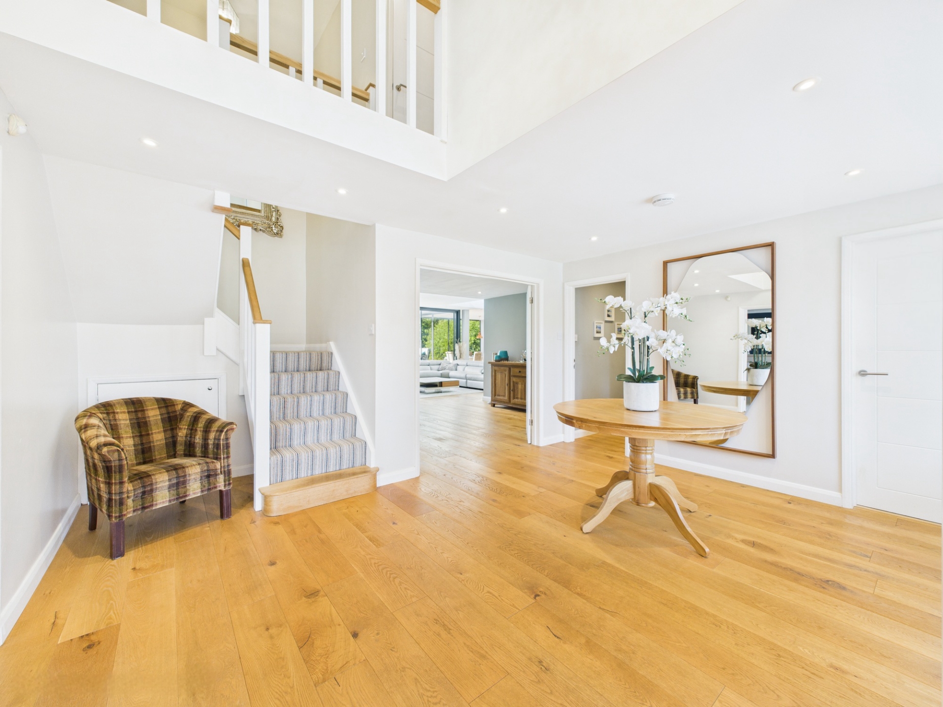 Upstairs, the galleried landing leads to five impressive bedrooms. The principal suite is particularly striking, featuring a tall, vaulted ceiling and an enormous window overlooking the garden. This suite also includes a walk-in wardrobe and a spacious en-suite shower room with twin sinks. The second bedroom also boasts a large en-suite. The remaining three bedrooms on this floor share access to a beautifully appointed family bathroom and a separate shower room, both finished to a high standard.
