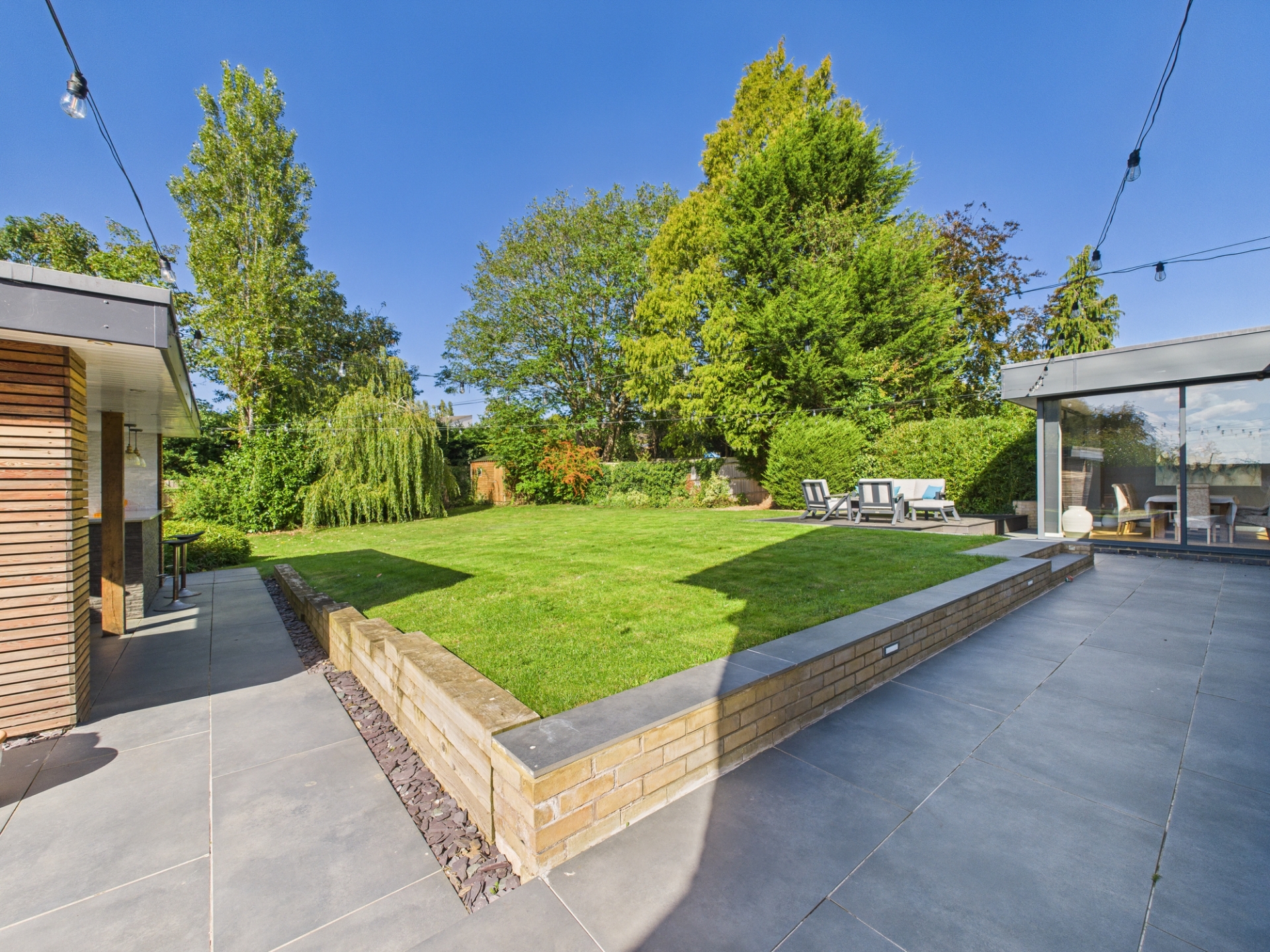 Outside, the front of the property features a lawned garden and a large driveway providing ample off-road parking. This leads to a deceptively long 10-meter tandem garage, which has a courtesy door opening directly onto the rear garden. The rear garden itself is private and west facing, with a porcelain tiled patio accessible from both the kitchen and cinema room. Beyond the patio lies a raised decked area and a spacious lawn bordered by mature plants and trees. Completing the garden is a fully equipped outdoor kitchen with a pizza oven, fitted units, wine chiller, sink, heaters, and a television.