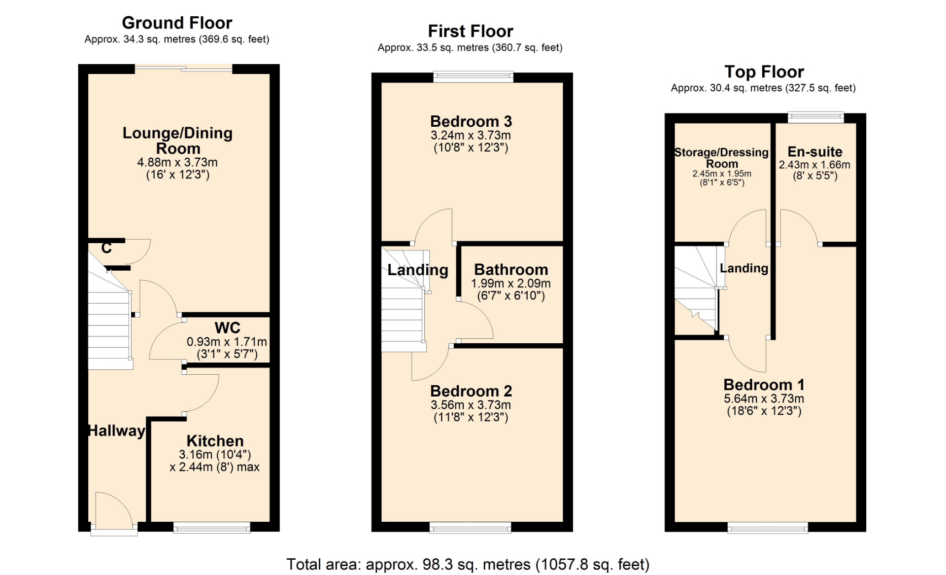 The first floor hosts two comfortable and well proportioned bedrooms, each offering flexibility for use as children’s rooms, guest rooms, or home office space. A contemporary family bathroom serves this level, fitted with modern fixtures and a clean, neutral d?cor. The second floor is dedicated to an impressive main suite, boasting a generously sized bedroom, a private ensuite shower room, and a substantial walk in wardrobe that adds a touch of luxury and convenience.