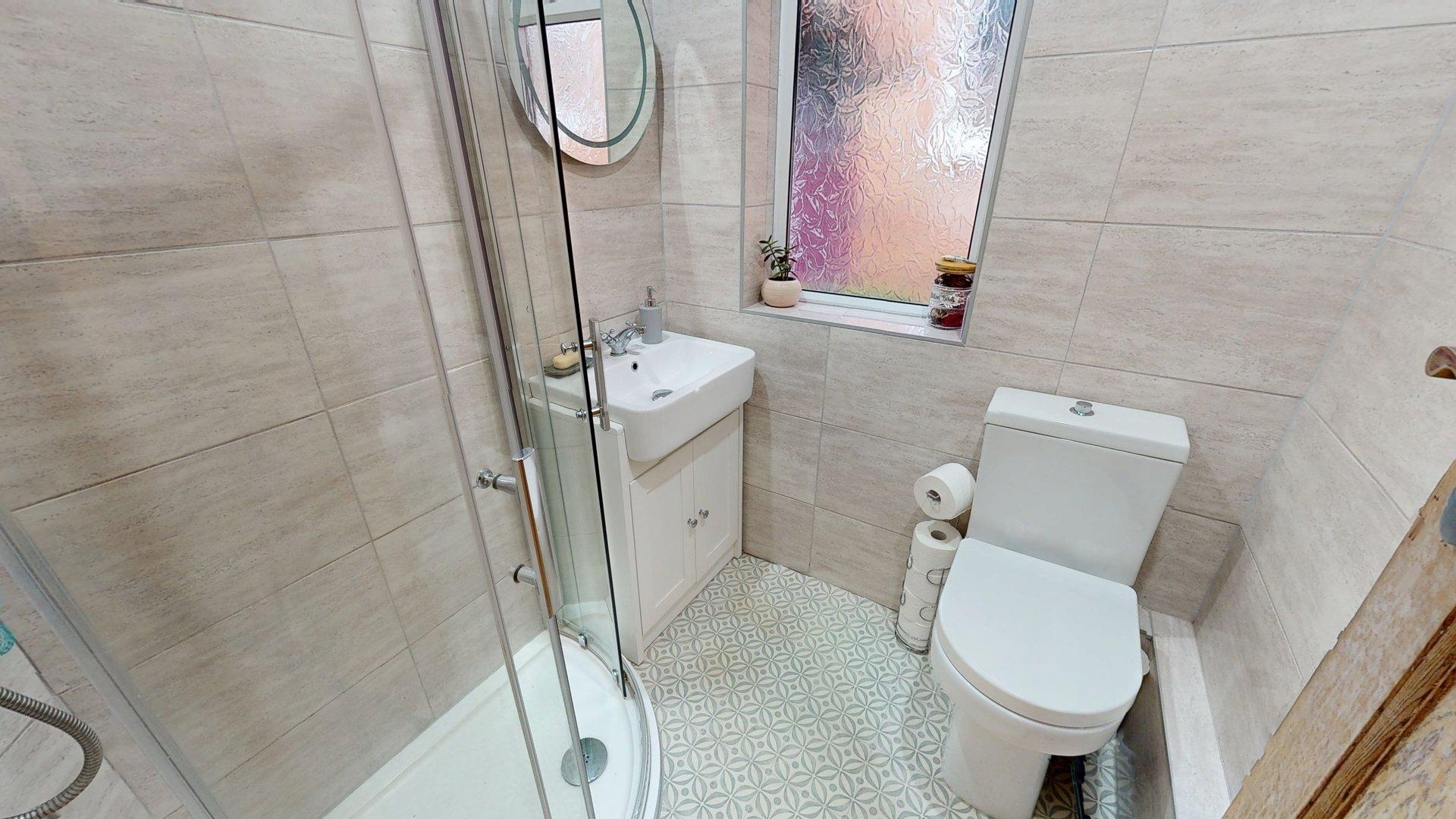 Obscure uPVC double glazed window to side elevation. Wash hand basin in vanity unit with mixer tap. WC. corner shower cubicle with two shower heads. Heated towel rail. Extractor.