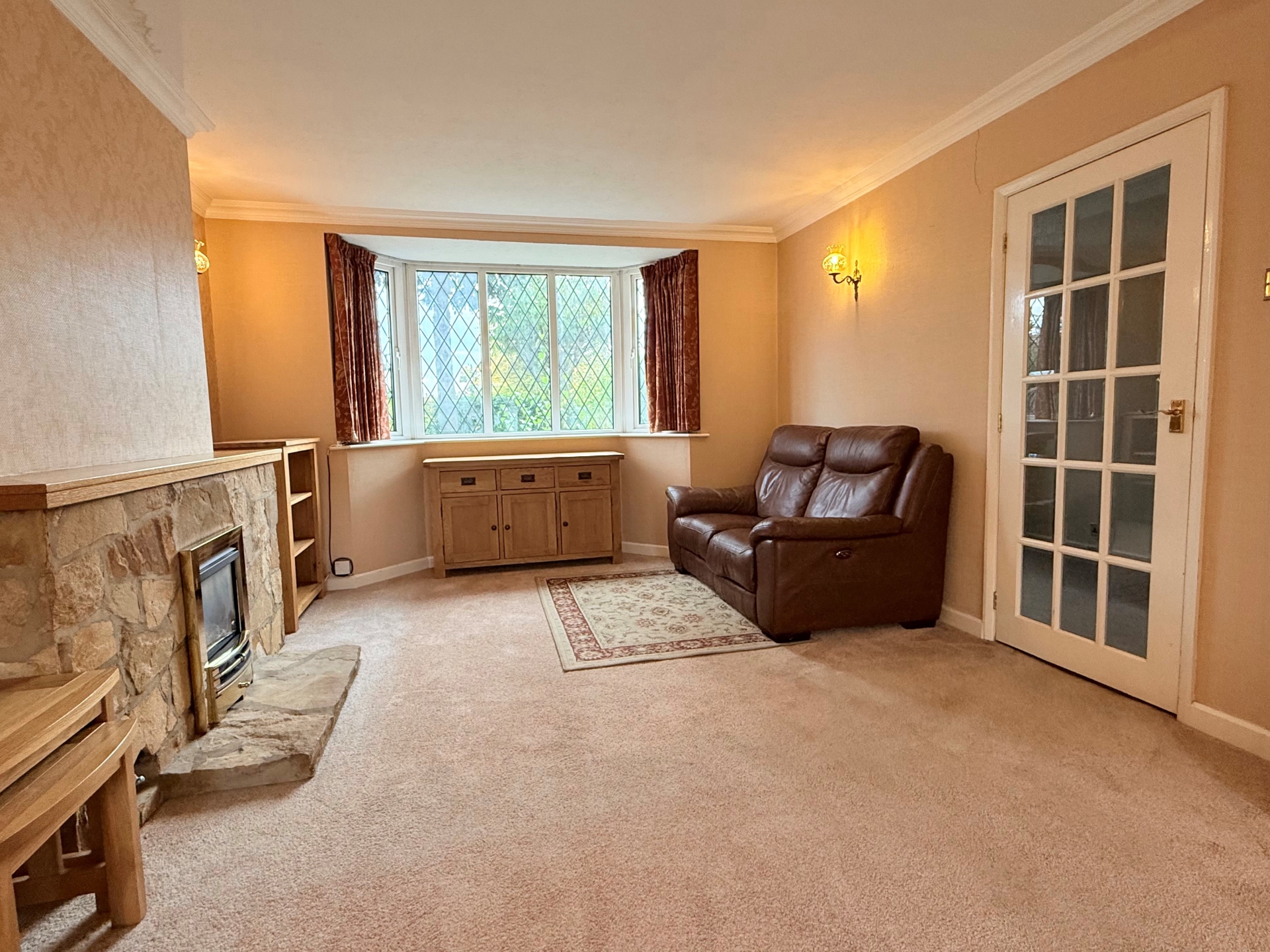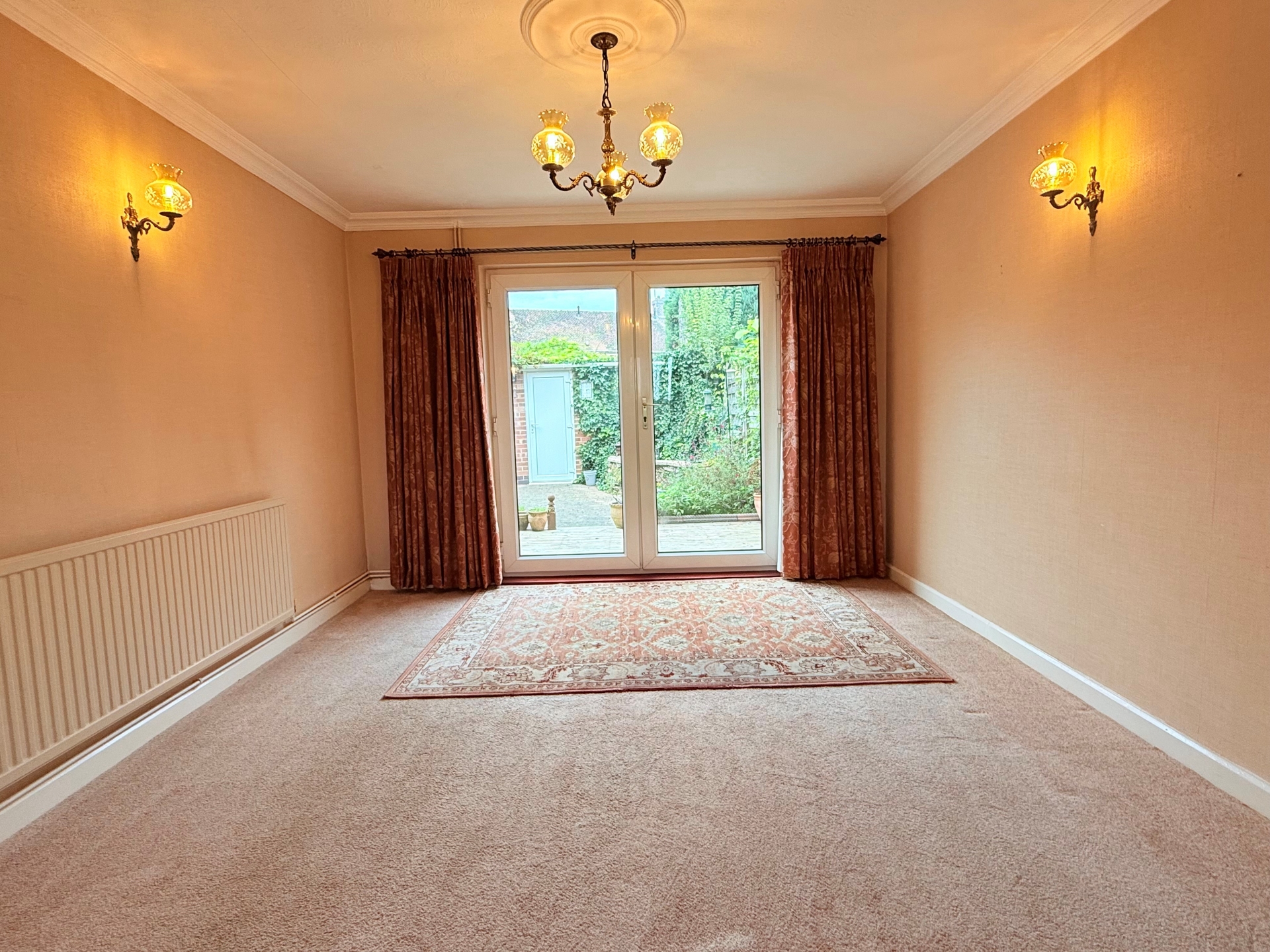 Dual aspect double glazed bay window to front elevation and double glazed French doors to rear elevation. Coving. Feature fireplace with gas fire. Radiator to rear.
