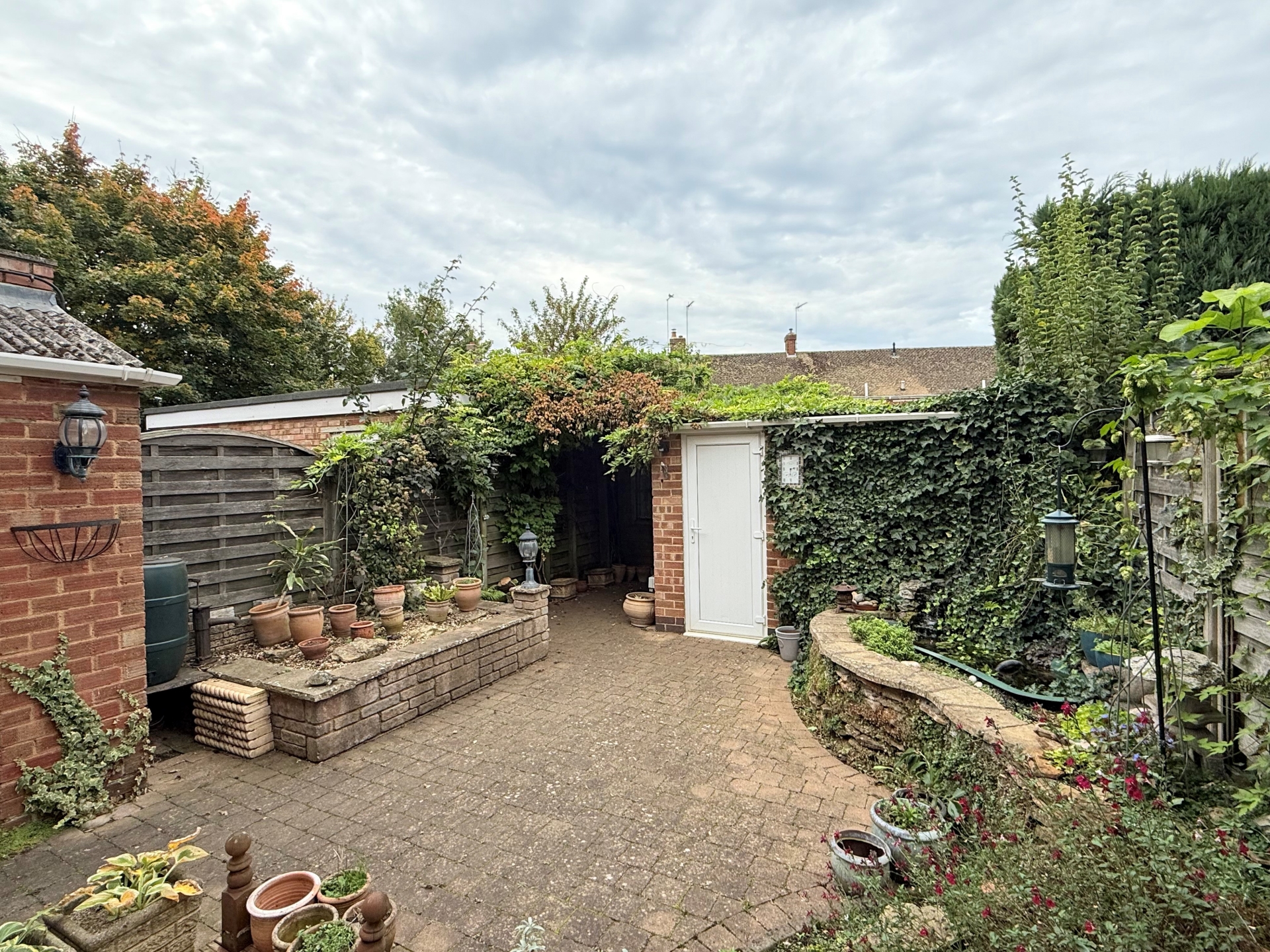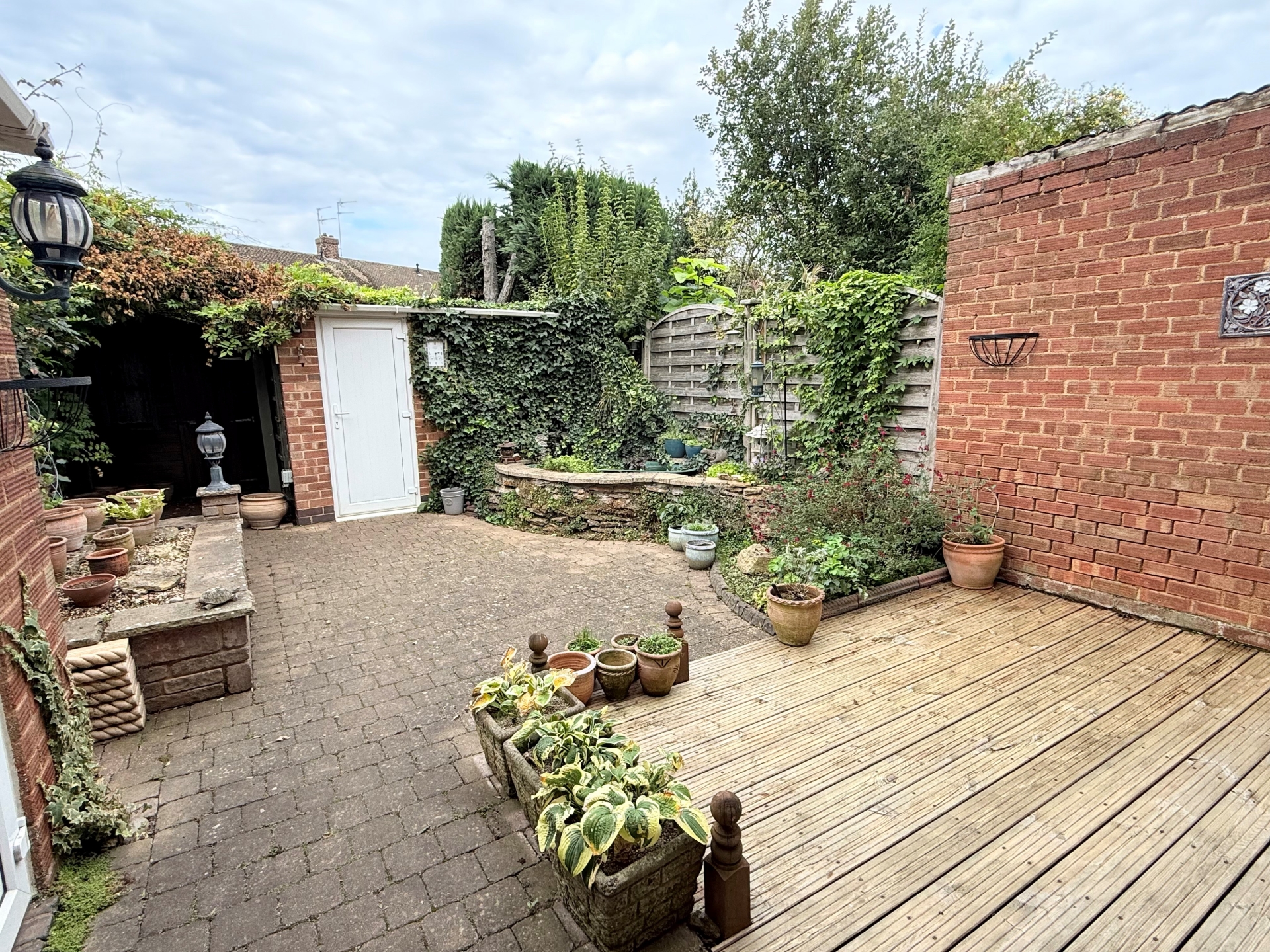 Enclosed rear garden. Block paved patio area. Decking area for seating. Raised beds for planting. Garden pond and waterfall. Door to garage. Covered pergola area. Shed at rear. Brick outbuilding with power and lighting