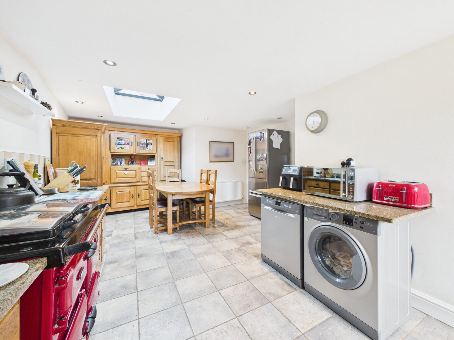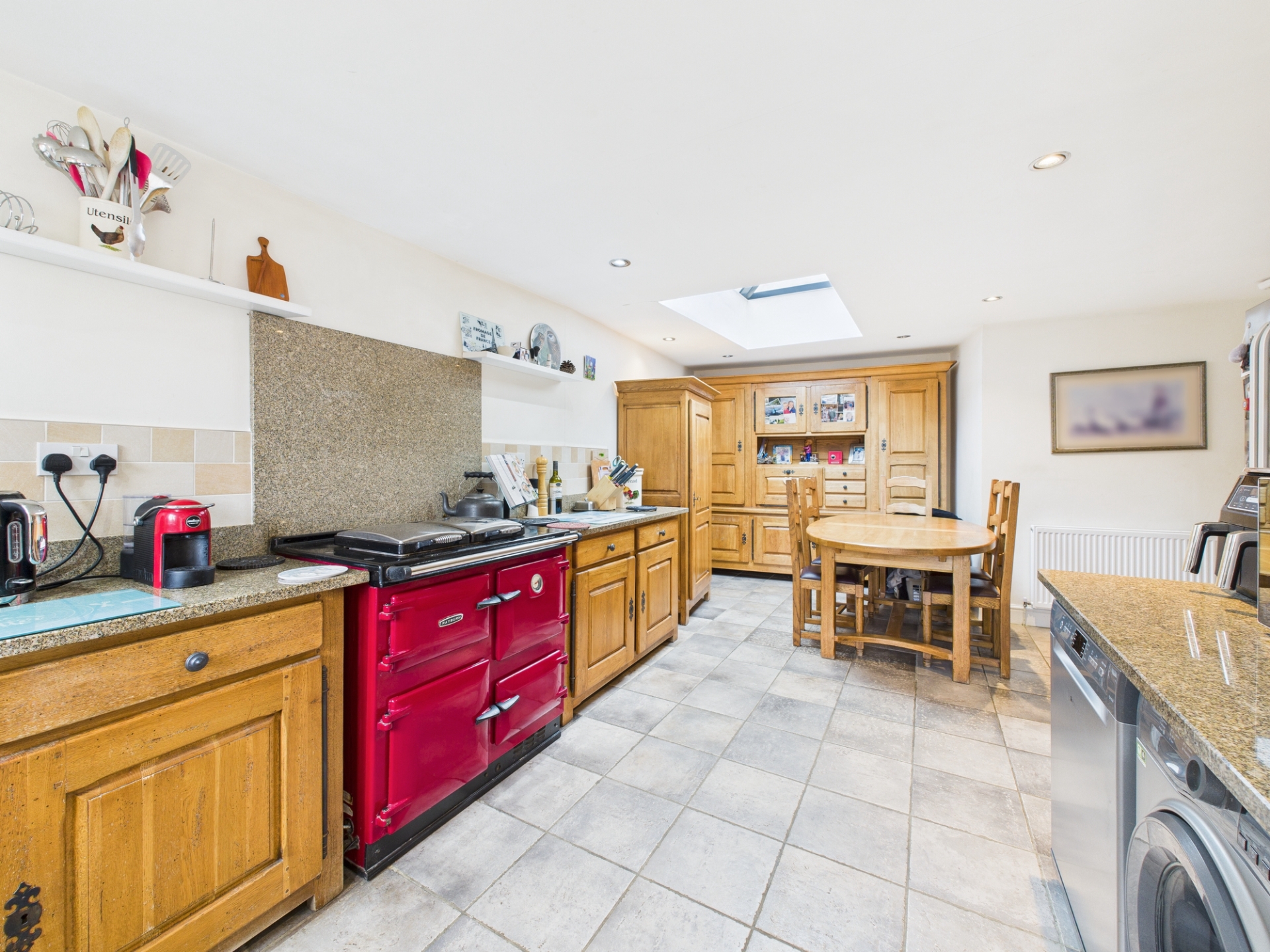 Lantern window. Radiator. Base mounted units. Belfast sink with mixer tap. Gas Raeburn stove. Granite worktops. Wooden door leading to garden. Access to shower room.