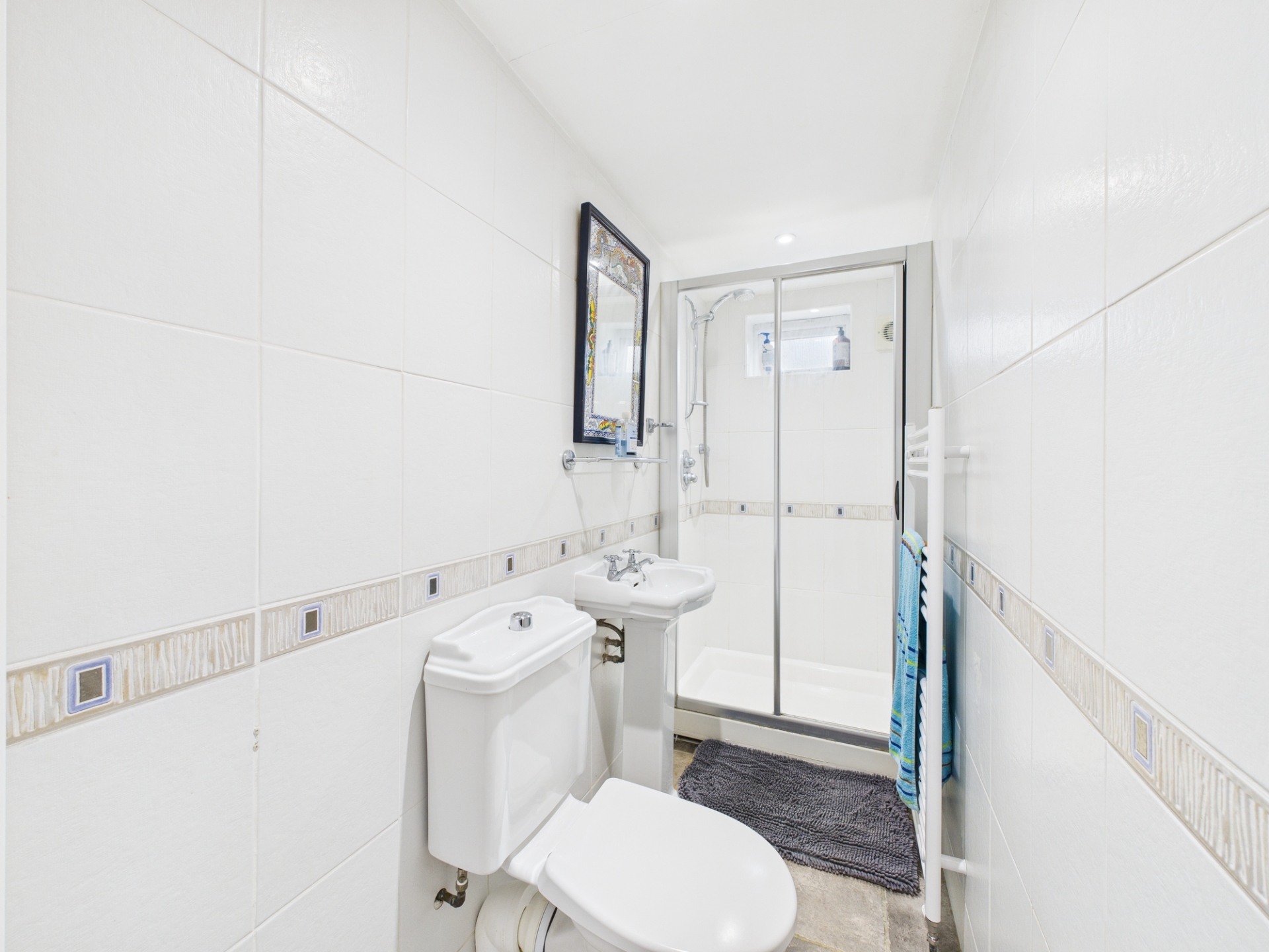 WC, wash hand basin and shower cubicle. Heated towel rail.