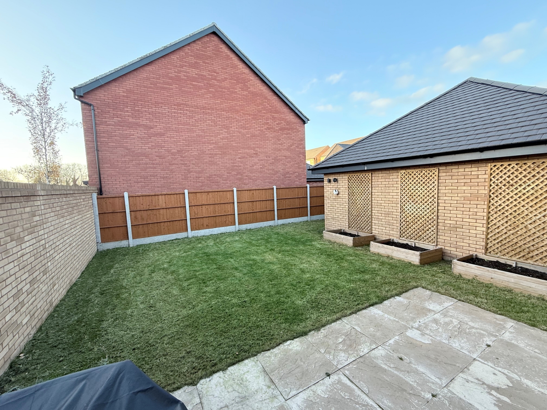 Outside, the rear garden offers a neatly landscaped lawn, raised planters, and a paved seating area perfect for relaxing or entertaining. The property further benefits from a single garage and driveway, providing secure parking and additional storage.