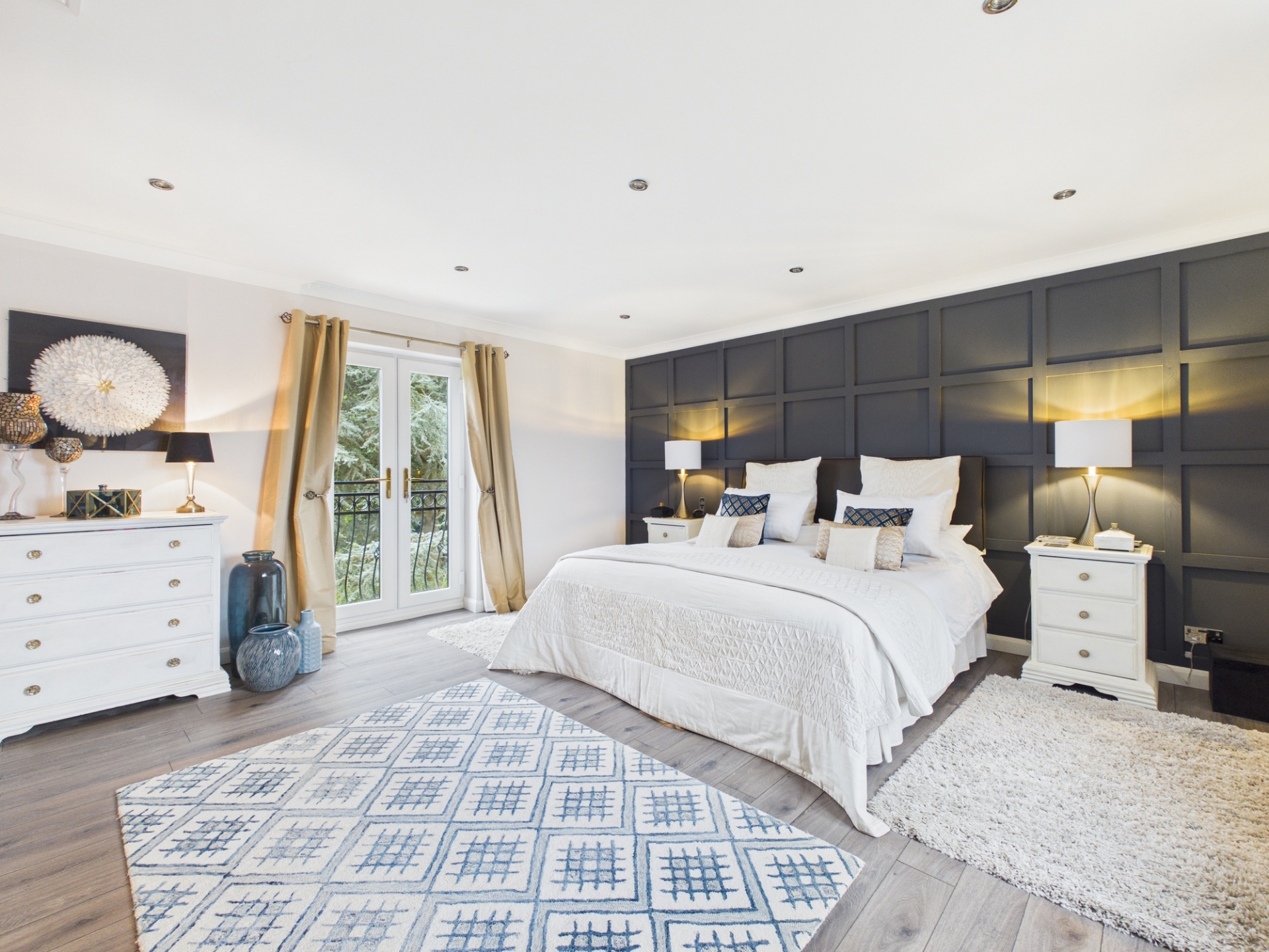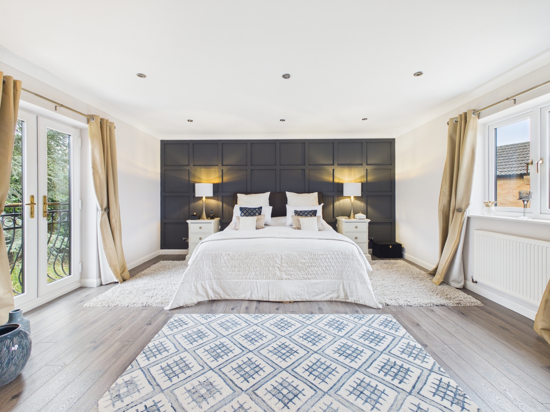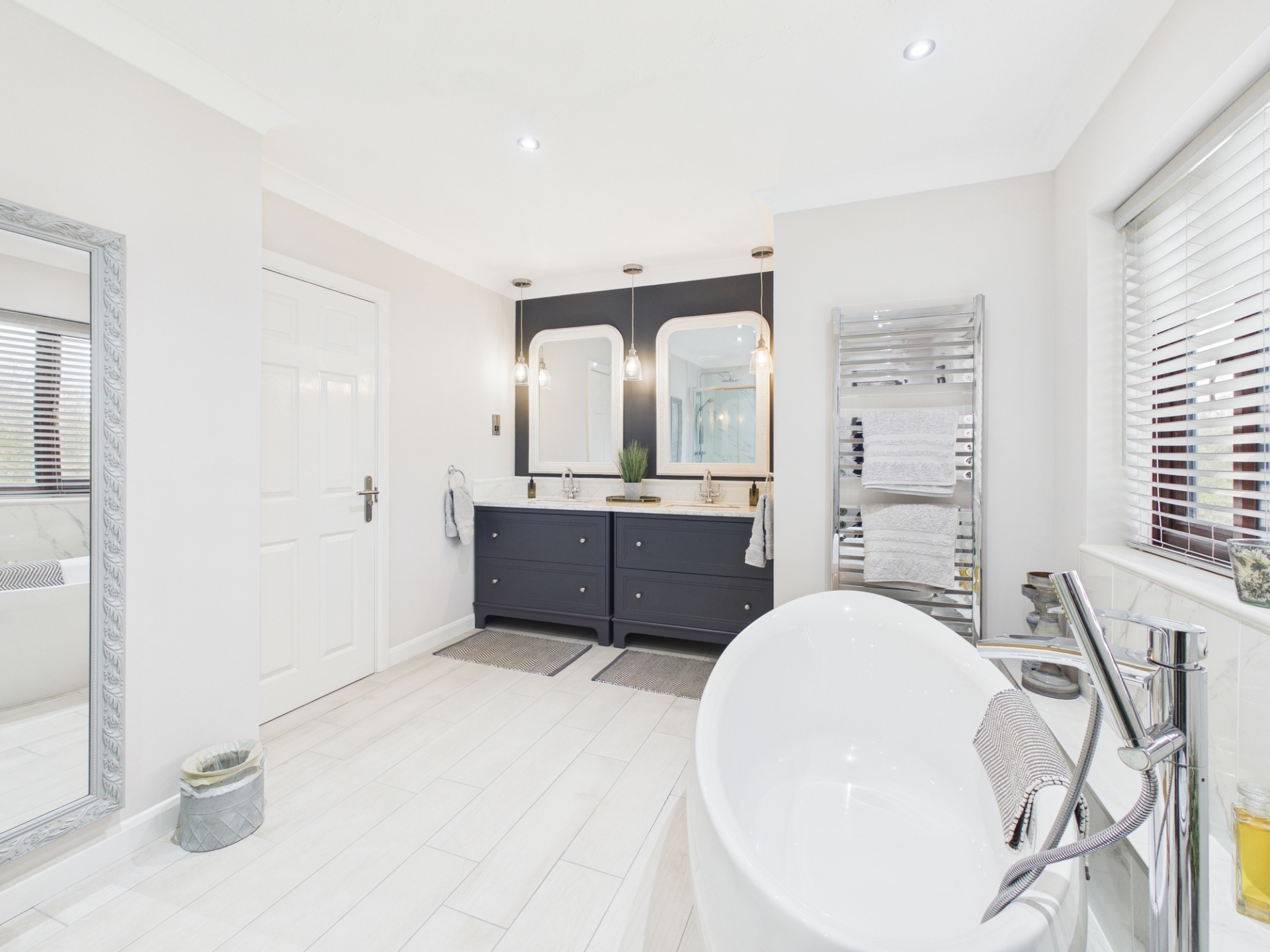Upstairs, the principal bedroom suite includes a large dressing room with built in wardrobes, leading through to the spacious bedroom area with double doors opening onto a Juliet balcony. The luxurious en-suite bathroom features a modern freestanding bath, large shower cubicle, and twin underslung wash hand basins with quartz worktops and storage below.