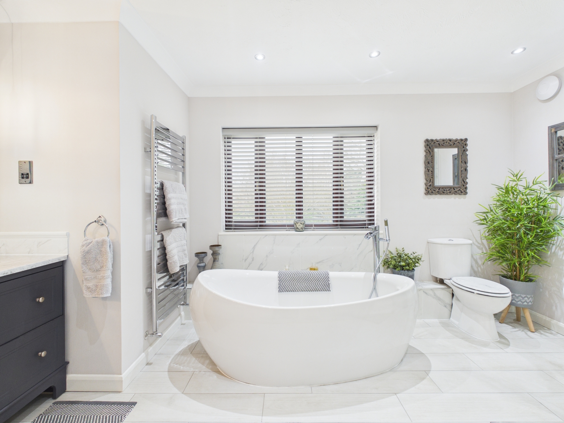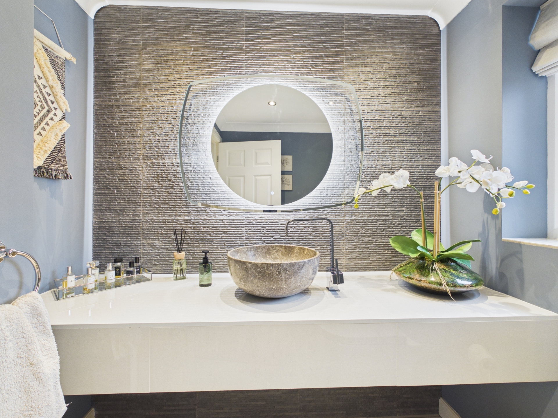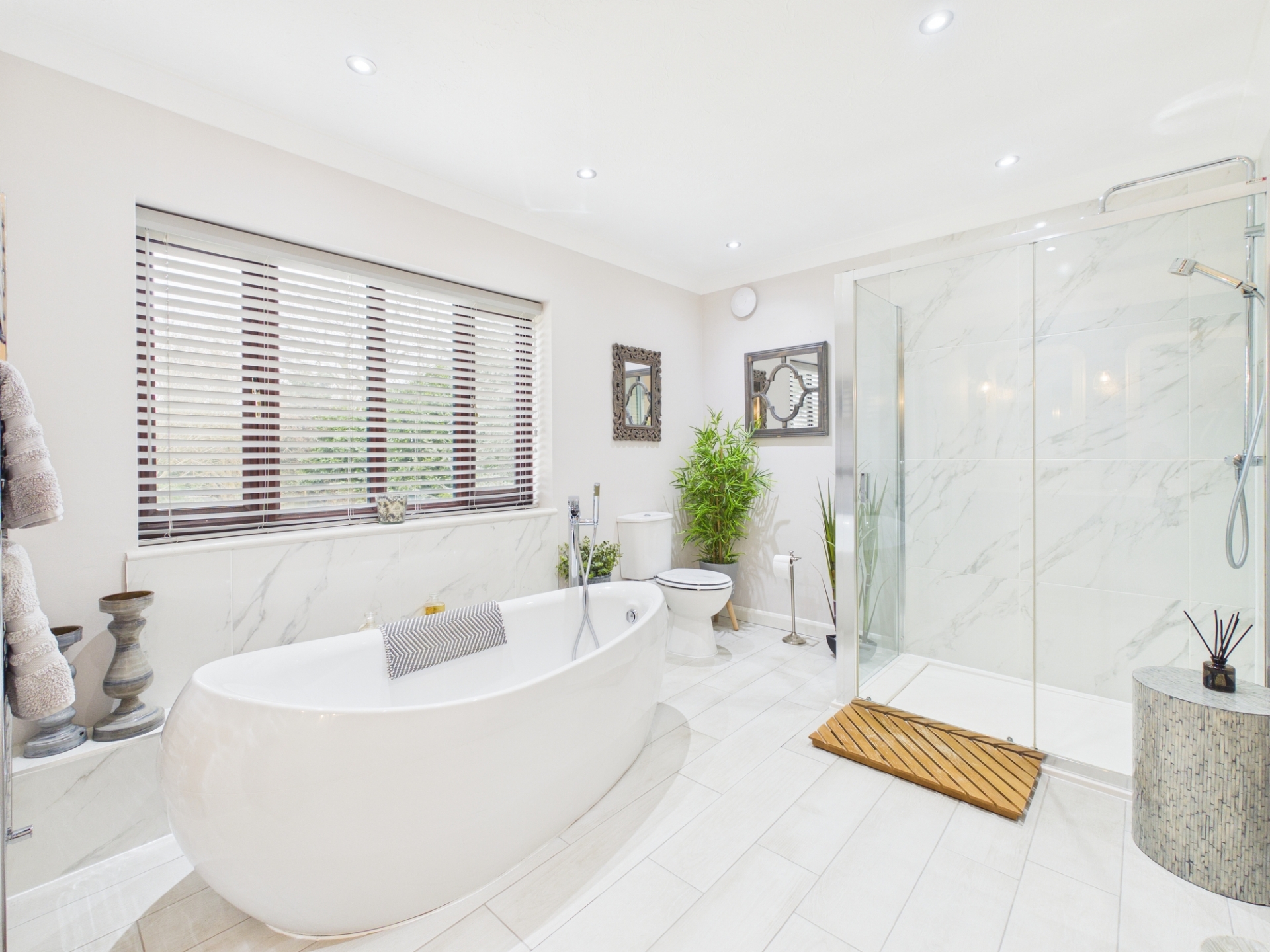 Upstairs, the principal bedroom suite includes a large dressing room with built in wardrobes, leading through to the spacious bedroom area with double doors opening onto a Juliet balcony. The luxurious en-suite bathroom features a modern freestanding bath, large shower cubicle, and twin underslung wash hand basins with quartz worktops and storage below.