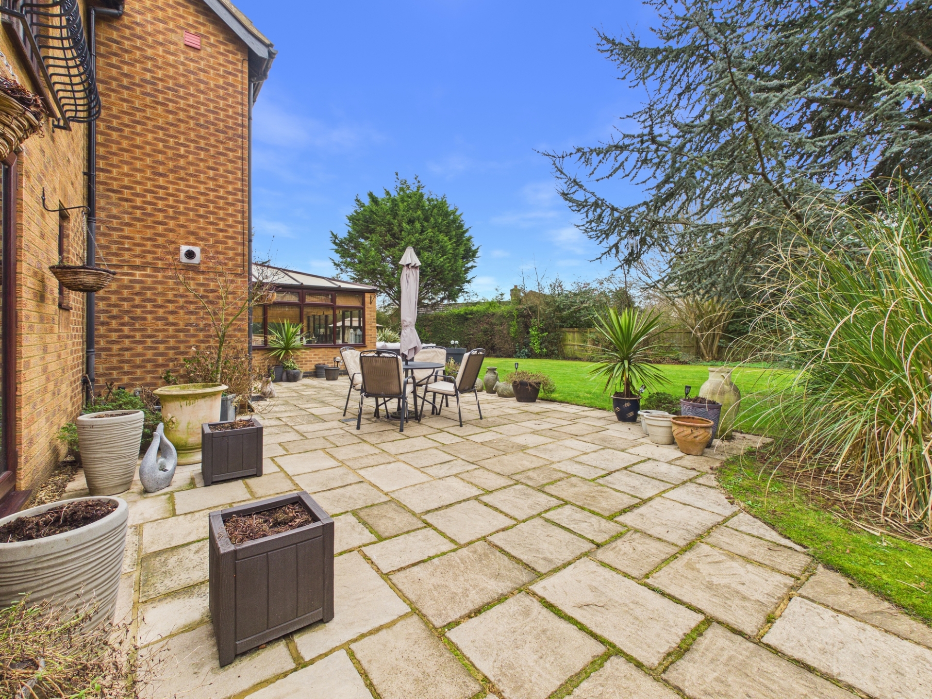 The conservatory provides ample space for both sofas and a dining table, and connects seamlessly to the paved terrace area in the garden.