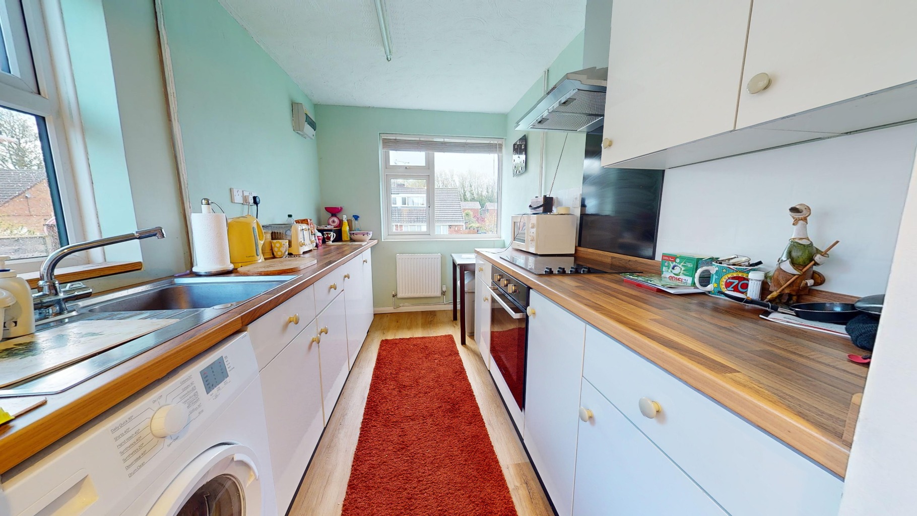 UPVC double glazed windows to front and side elevations. Radiator. Rage of base and eye level units with worktop surfaces over incorporating stainless steel sink unit and drainer. Tiled splash back areas. Built in oven and induction hob with extractor over.