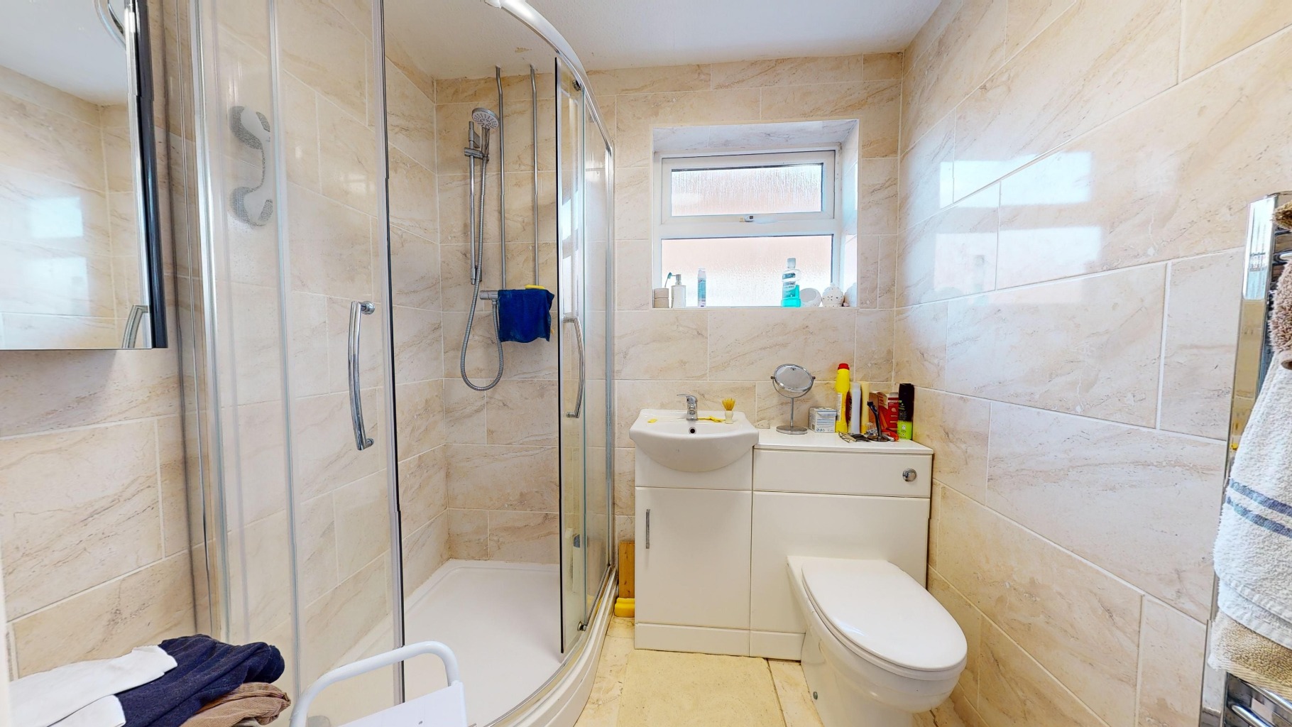 Obscure UPVC double glazed window to to side elevation. Heated towel rail. Suite comprising low level WC, wash hand basin in vanity unit with mixer tap over, and shower cubicle. Fully tiled.