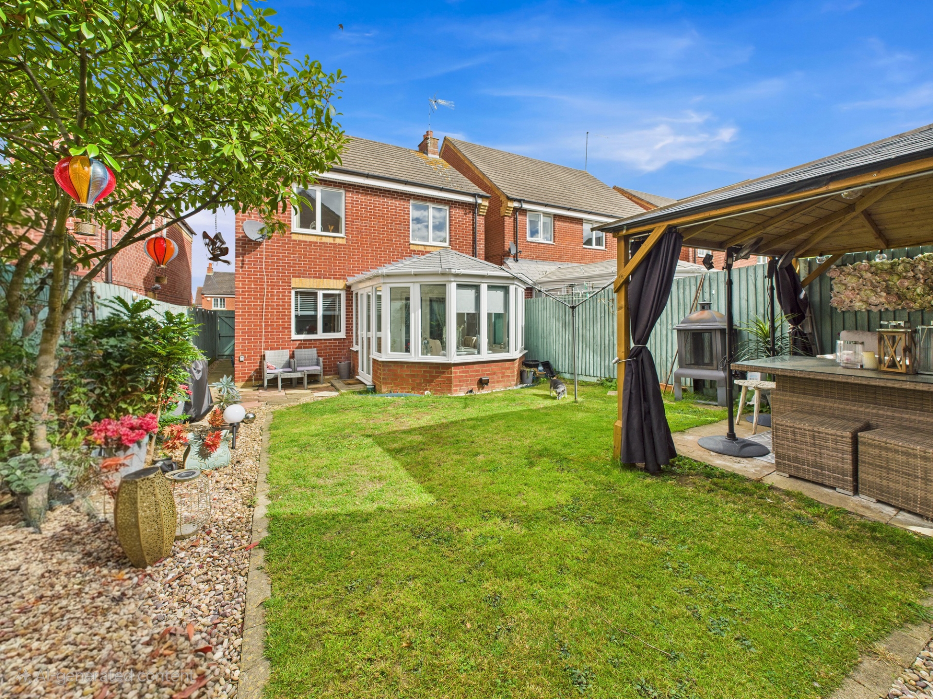 A pretty, south facing garden. Bordered with gravel, ideal for potted plants. Enclosed by timber fencing. Patio area with pergola over, perfect for entertaining. Small lawned area. Timber gated to front.