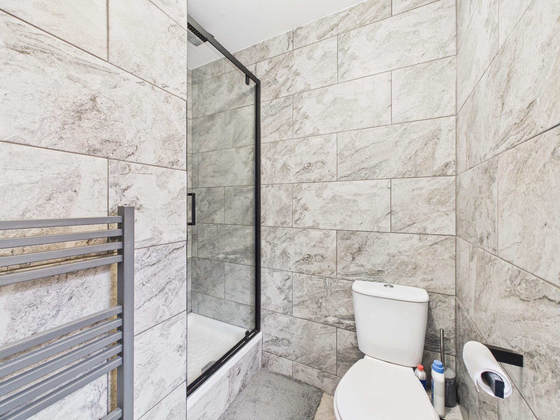 uPVC obscure double glazed window to side elevation. Ladder style heated towel rail. Suite comprising wash hand basin set in storage unit, WC and mains powered rainfall shower. Graphite tiled walls.