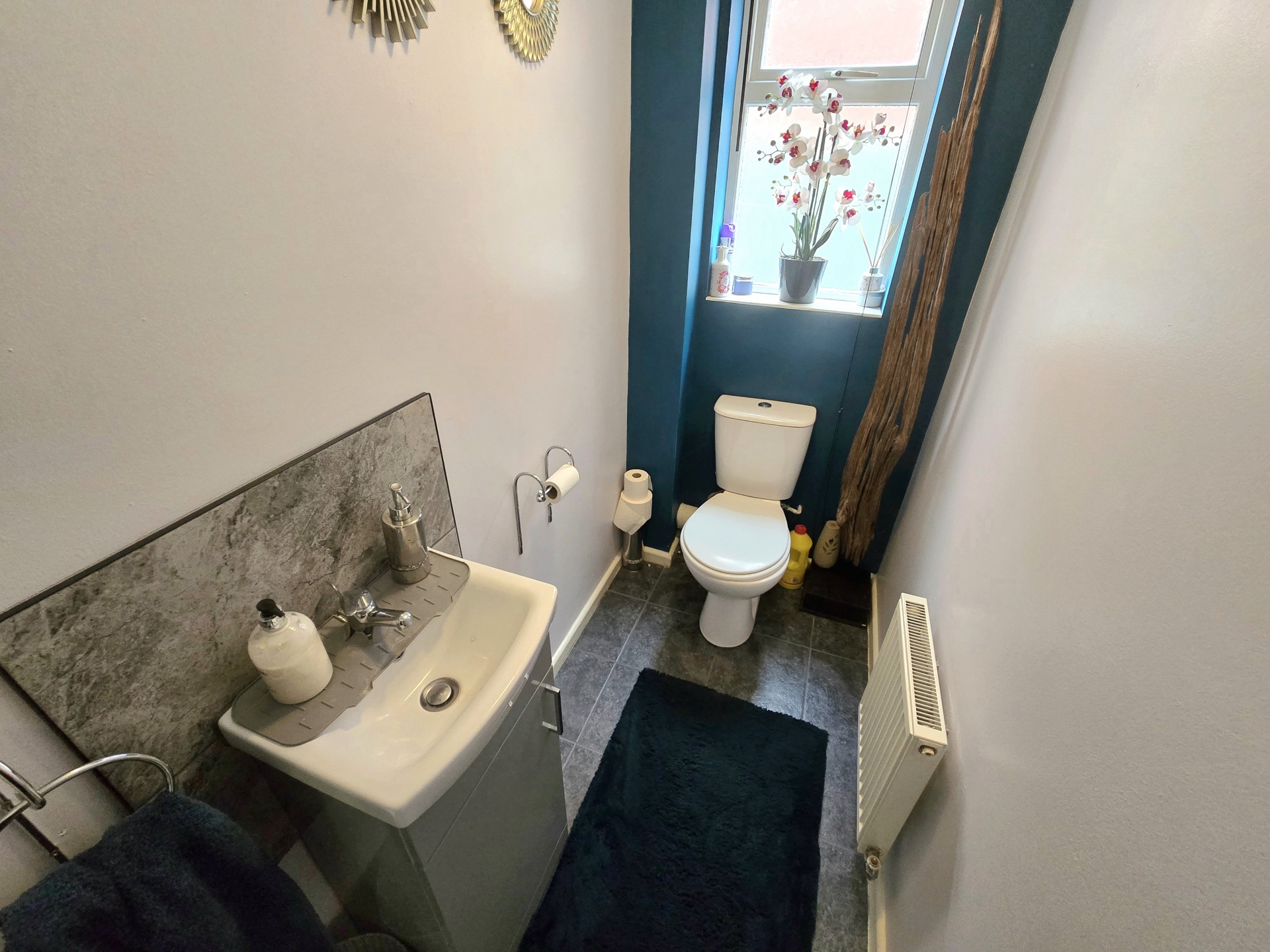 uPVC double glazed obscure window to side elevation. Radiator. Suite comprising WC and wash hand basin with storage cupboard beneath. Tiling to splash back areas. Tiled flooring.