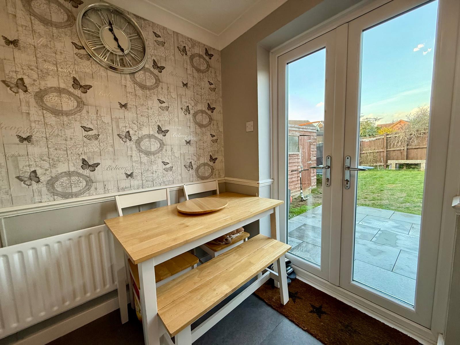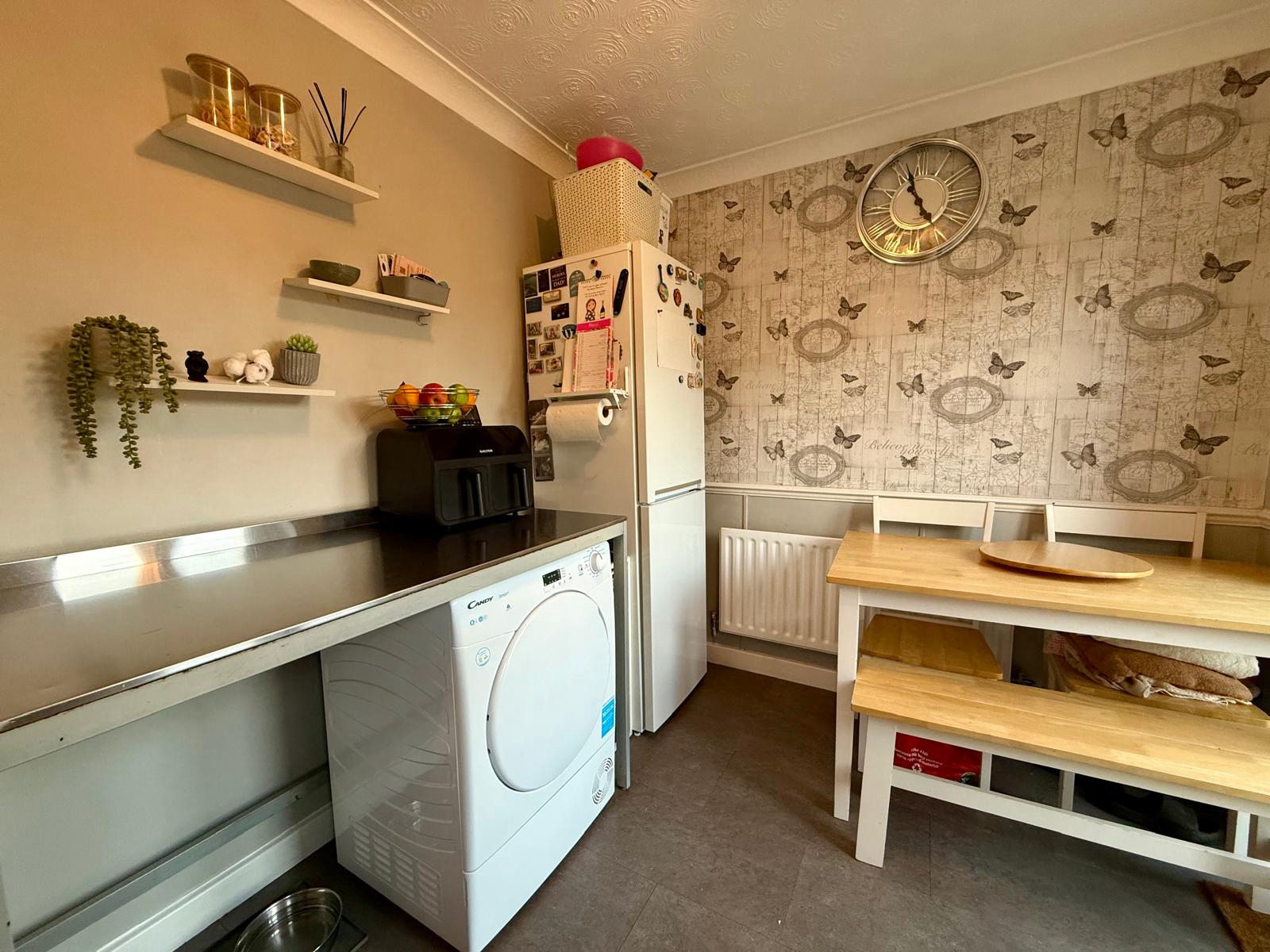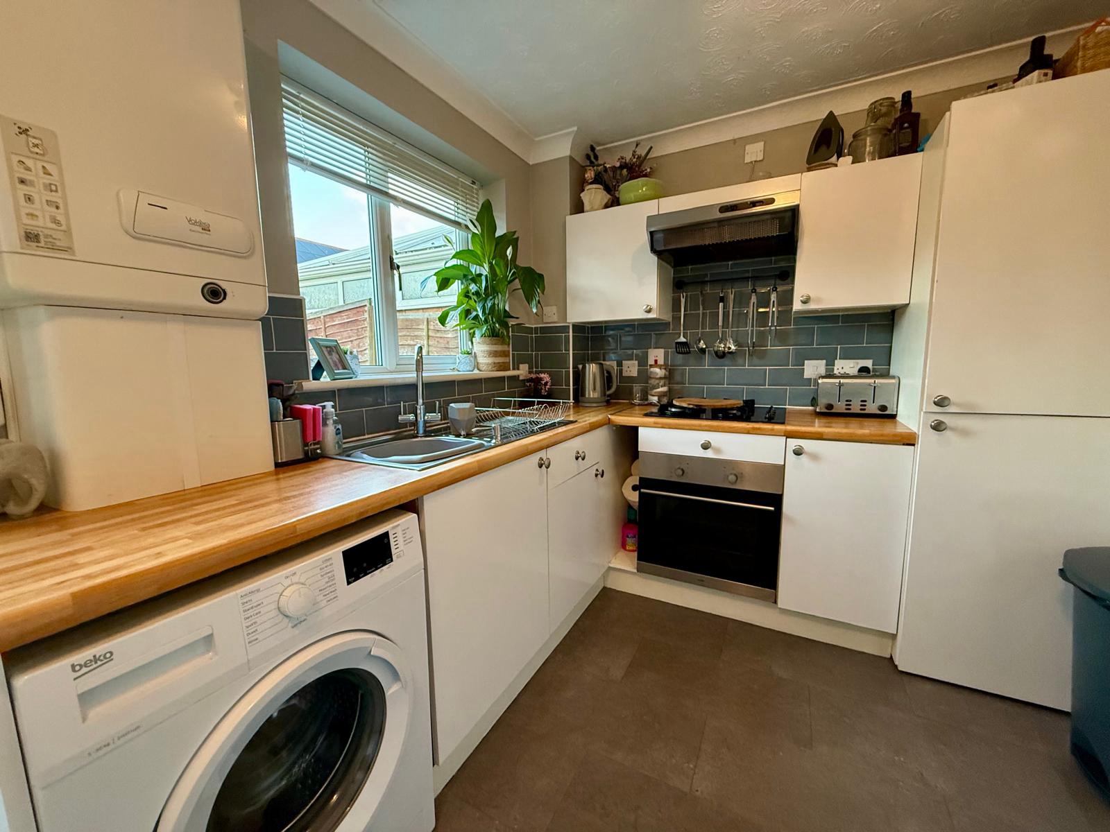 Double glazed window to rear elevation. Wall and base units. Combination boiler. Stainless steel sink and drainer. Space for washing machine, tumble dryer and fridge/freezer. Electric cooker, gas hob and extractor. Double glazed French doors to rear elevation.