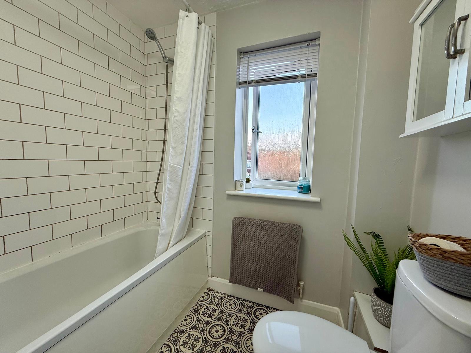 Double glazed window to rear elevation. Suite comprising wash hand basin, bath with shower over and WC.
