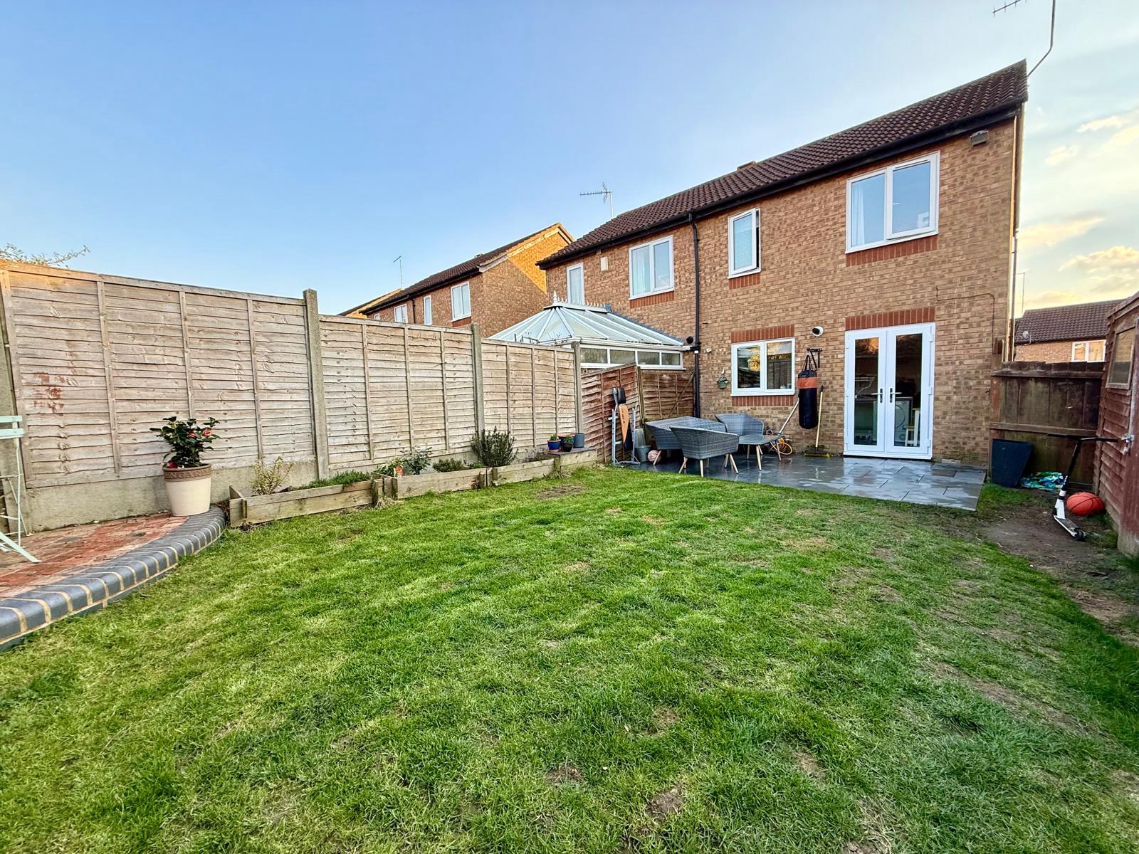Paved seating area. Side access. Fenced boundary. Lawn and wooden shed.