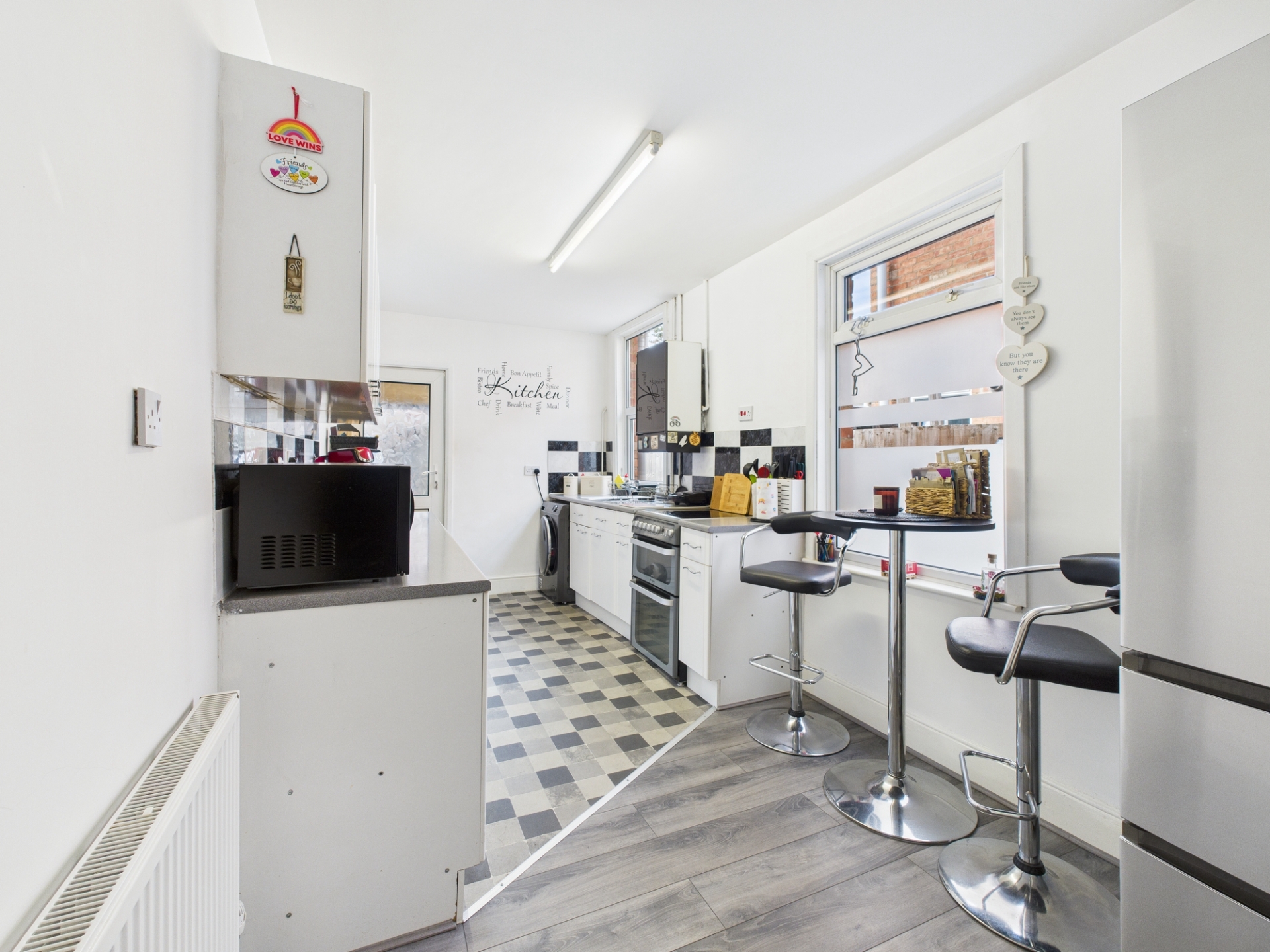 Two double glazed windows to side elevation. Radiator. Fitted with a range of wall and base units. Stainless steel sink with taps over. Space for freestanding oven and white goods. Wall mounted boiler. Doors to: