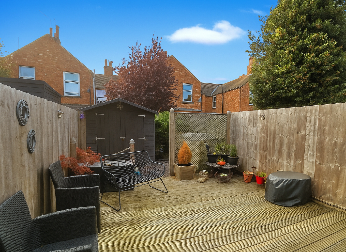 Landscaped with astro turf and decked area. Steps down to gravelled section with shed. Enclosed by fencing. Electric sockets.