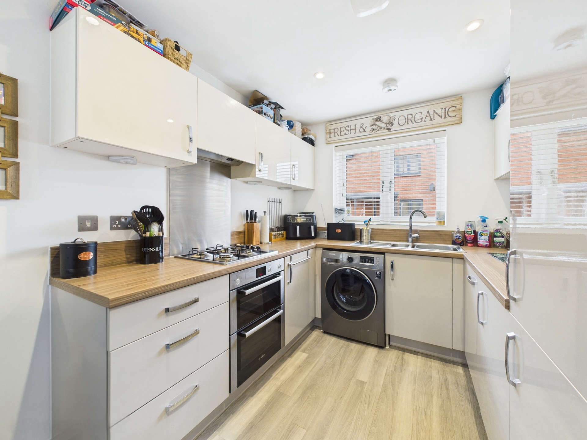 uPVC double glazed window to front elevation. Stainless steel sink and drainer with stainless steel mixer tap. Roll top wood effect work surface. A range of wall mounted and base level units. Integrated fridge and freezer, dishwasher, gas hob with concealed extractor fan. Space for white goods. Tiles to splashback areas. Laminate flooring.