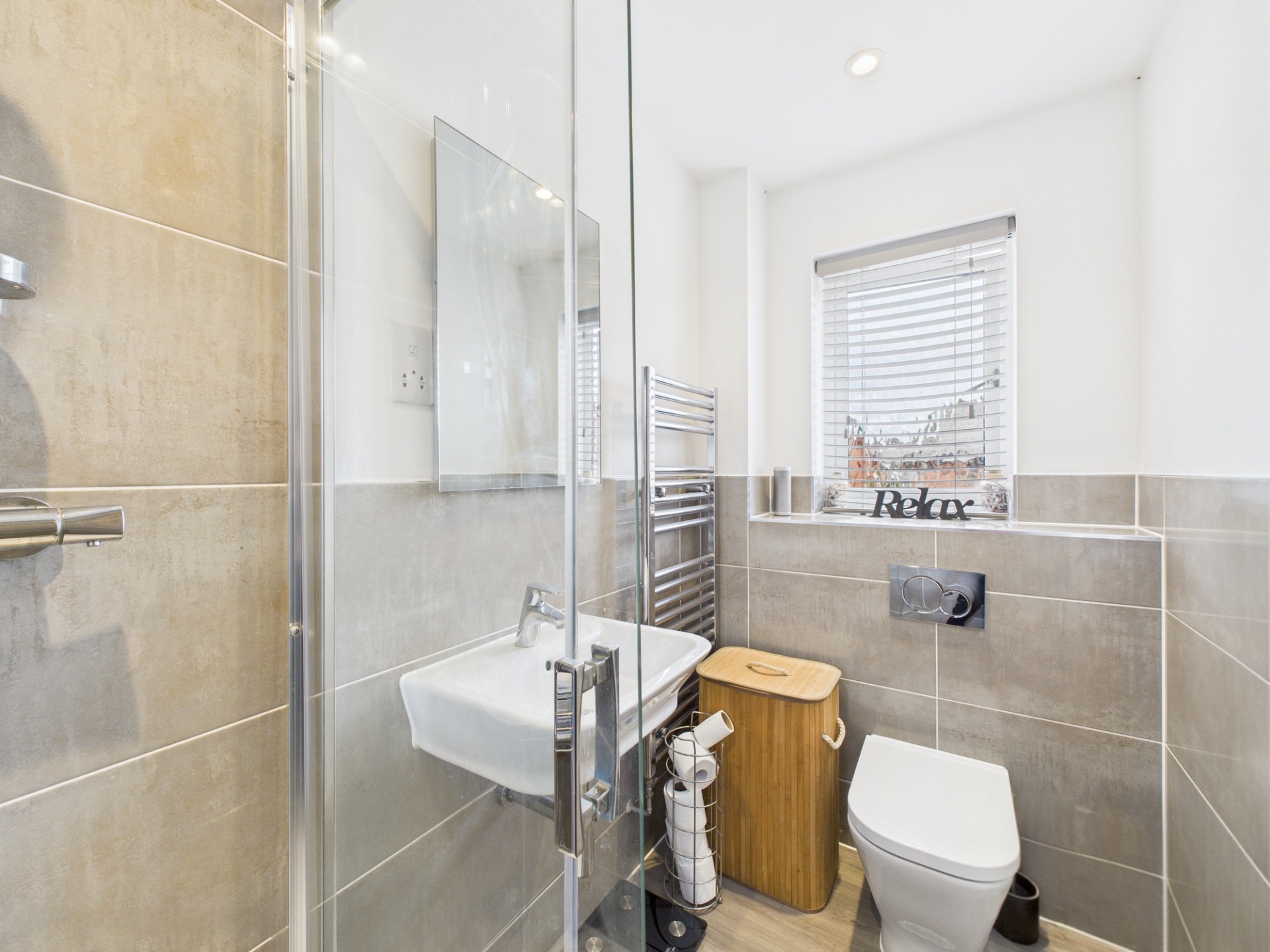 uPVC obscure double glazed window to rear elevation. Wall mounted basin. Double shower. Low level WC. Laminate flooring. Chrome heated towel rail.