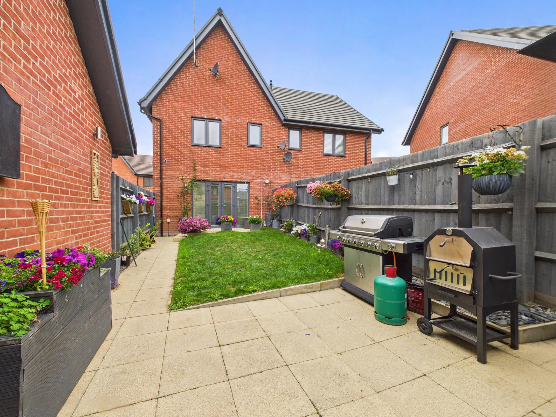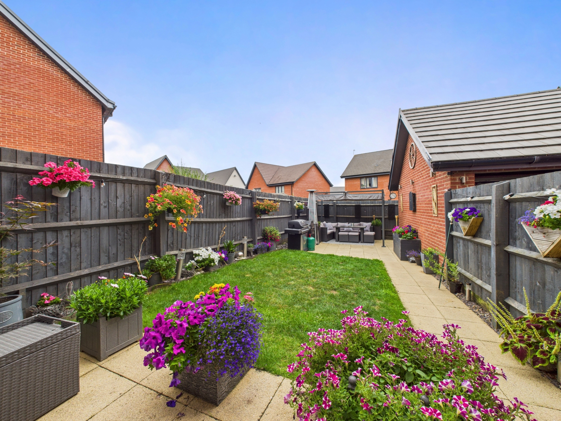 Two patio entertainment areas. Mainly laid to lawn. Enclosed by wood fence panelling. Side access.
