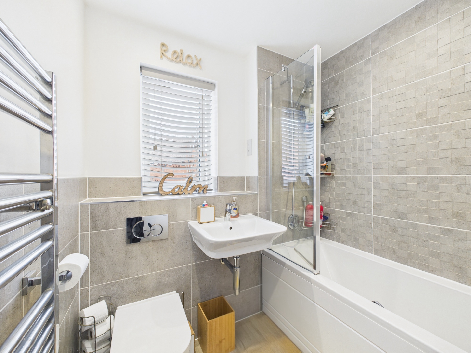 uPVC obscure double glazed window to front elevation. Bath with shower over. Wall mounted basin. Low level WC. Chrome heated towel rail. Tiled splashback areas. Laminate flooring.