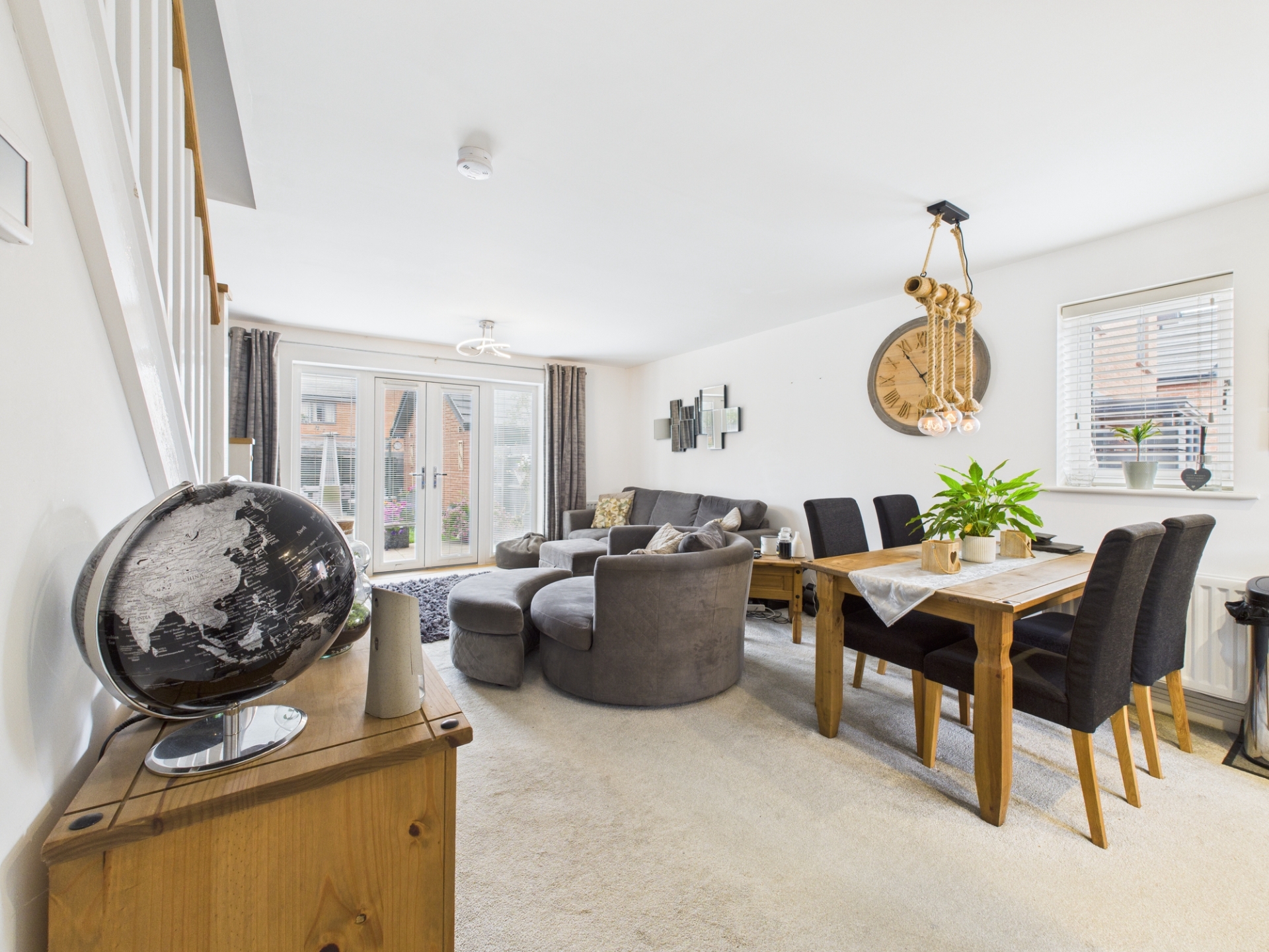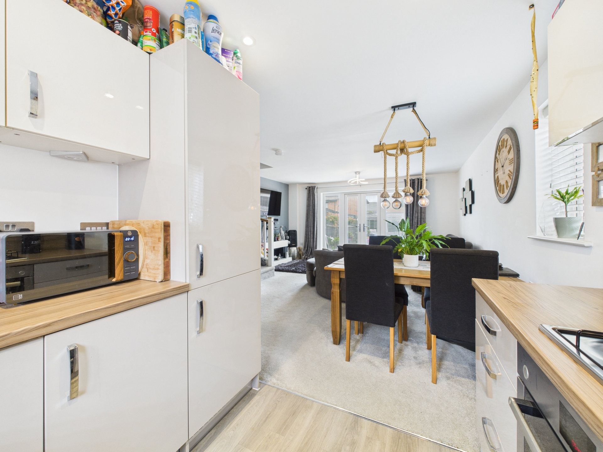 uPVC double glazed French door to rear elevation with full length uPVC double glazed panels to either side. uPVC double glazed window to side elevation. Two radiators. Understairs storage.
