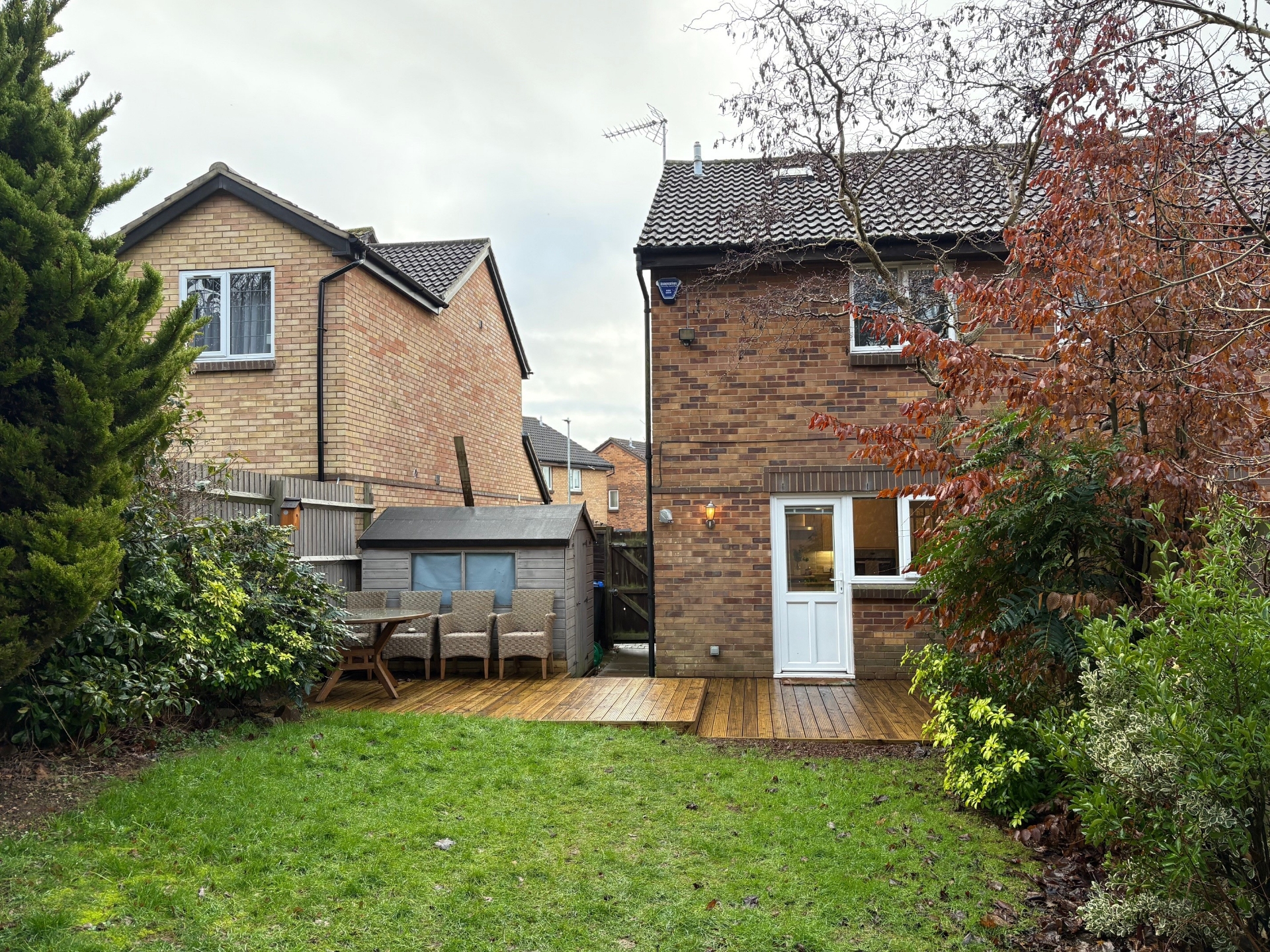 Outside the frontage is open plan with a private driveway to the side which is wider than average and a side gate to a generous sized rear garden with lawn and two decked seating areas and is not overlooked from the rear.