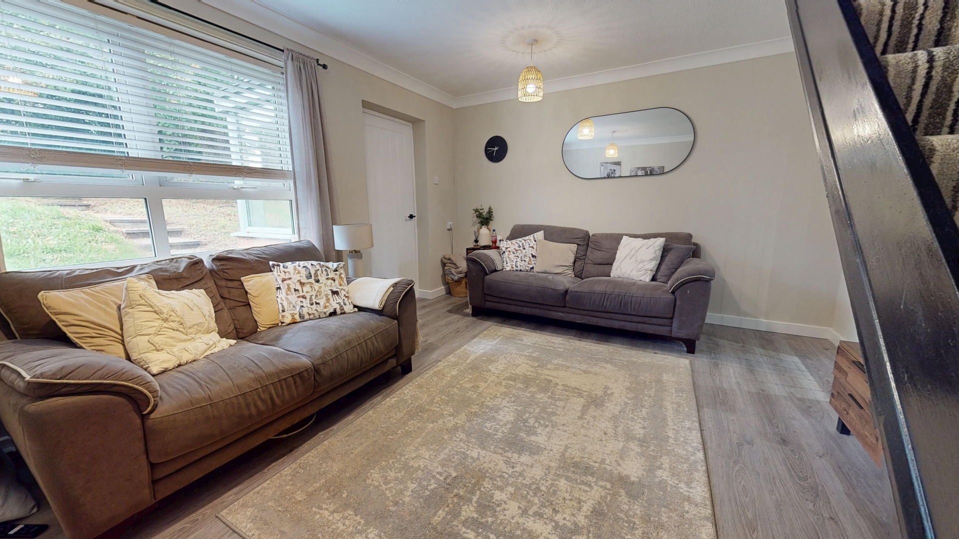uPVC double glazed window to front elevation. Staircase to first floor landing. Access to kitchen/dining. Laminate flooring.